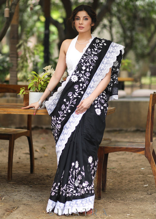 Mesmerising Black Chanderi Saree with Beautiful White Embroidery & Delicate Border