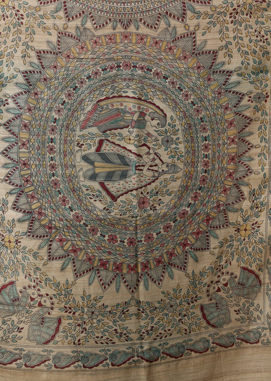 Madhubani art on pure silk with red chanderi pleats & pure silk piping