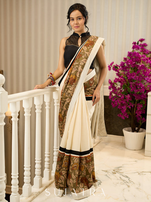 Elegant cream chanderi Hand painted saree with Ajrakh and Ikkat combination border