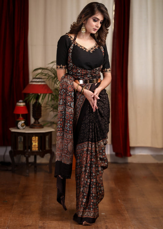 Sensuous maroon Ajrakh saree with black border & Accentuated with stone embellishment