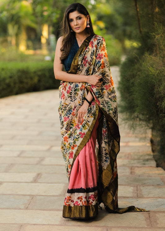Exclusive Madhubani painted cotton saree with Ajrakh pleats