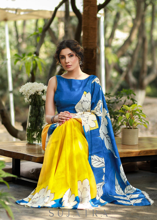 Graceful Yellow & Blue Pure Silk Handpainted Saree