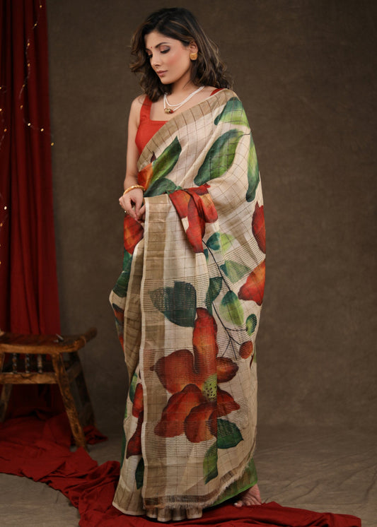 Exclusive Beige Pure Tussar Silk Hand Batik Saree with Zari