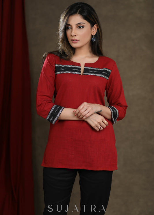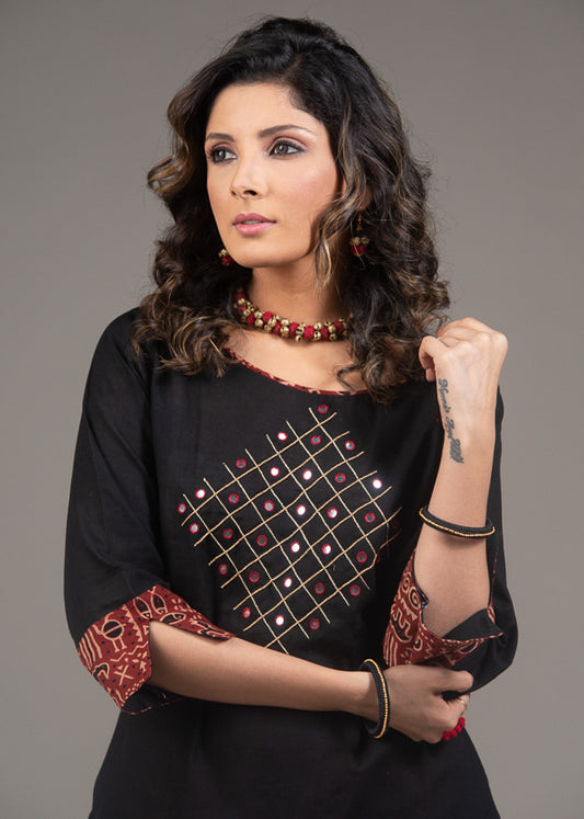 Hand embroidered zardozi mirror work with Ajrakh slit cuff black designer top