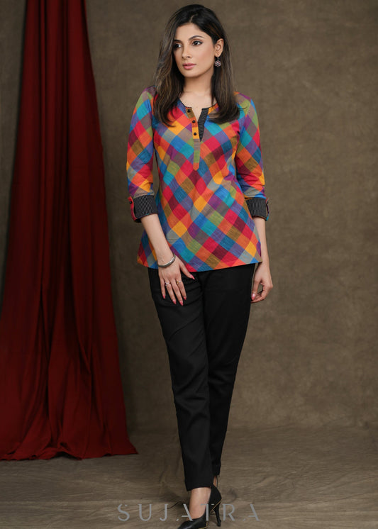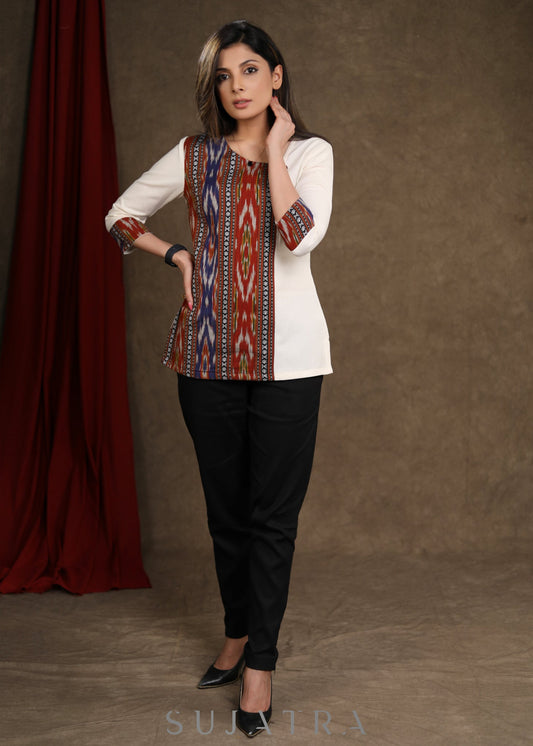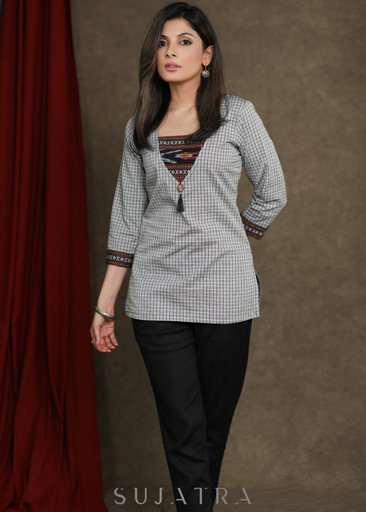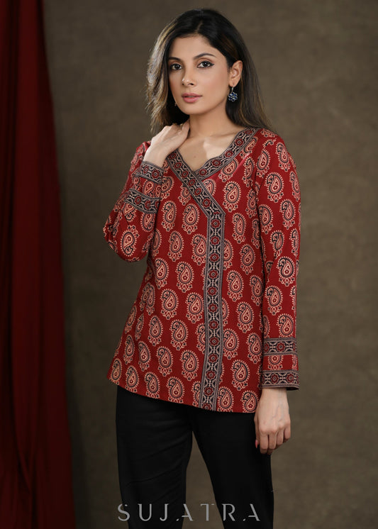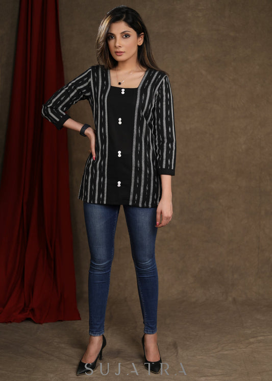 Black animal print Ajrakh pure cotton top with Ikat collar and cuff
