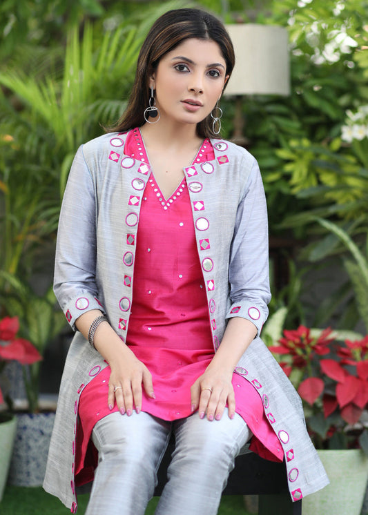 Exclusive Grey Cotton Silk Hand Mirror Work Jacket with contrast Cotton Silk Inner