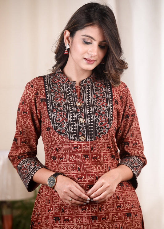 Elgent Cotton Ajrakh Tunic With Attractive Hand Work On Yoke