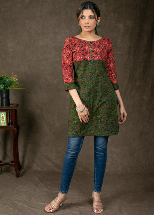 Stylish olive green cotton with ajrakh combination tunic