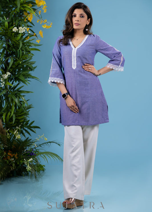 Trendy powder blue cotton tunic highlighted with elegant laces