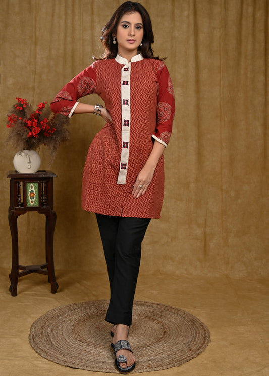 Exclusive maroon ajrakh cotton tunic with highlighted yoke