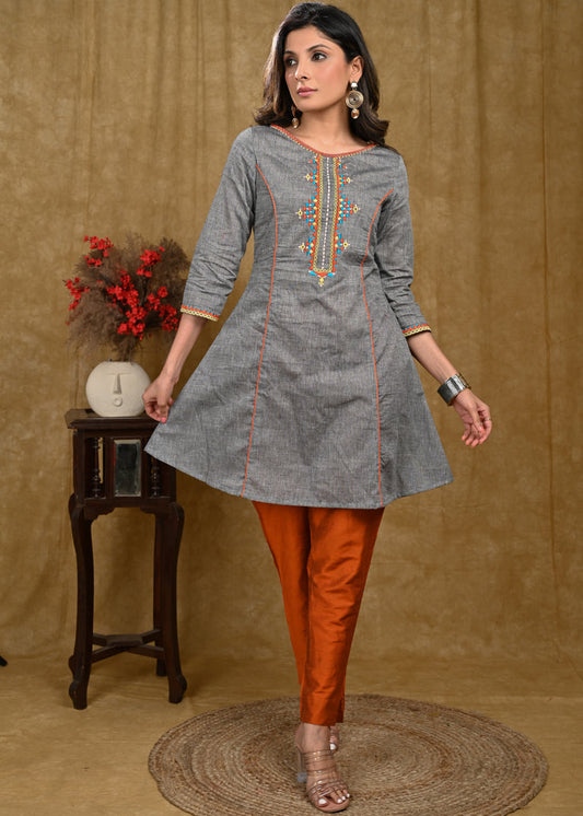 Exclusive Grey Handloom Cotton Tunic with Multicolor Embroidery