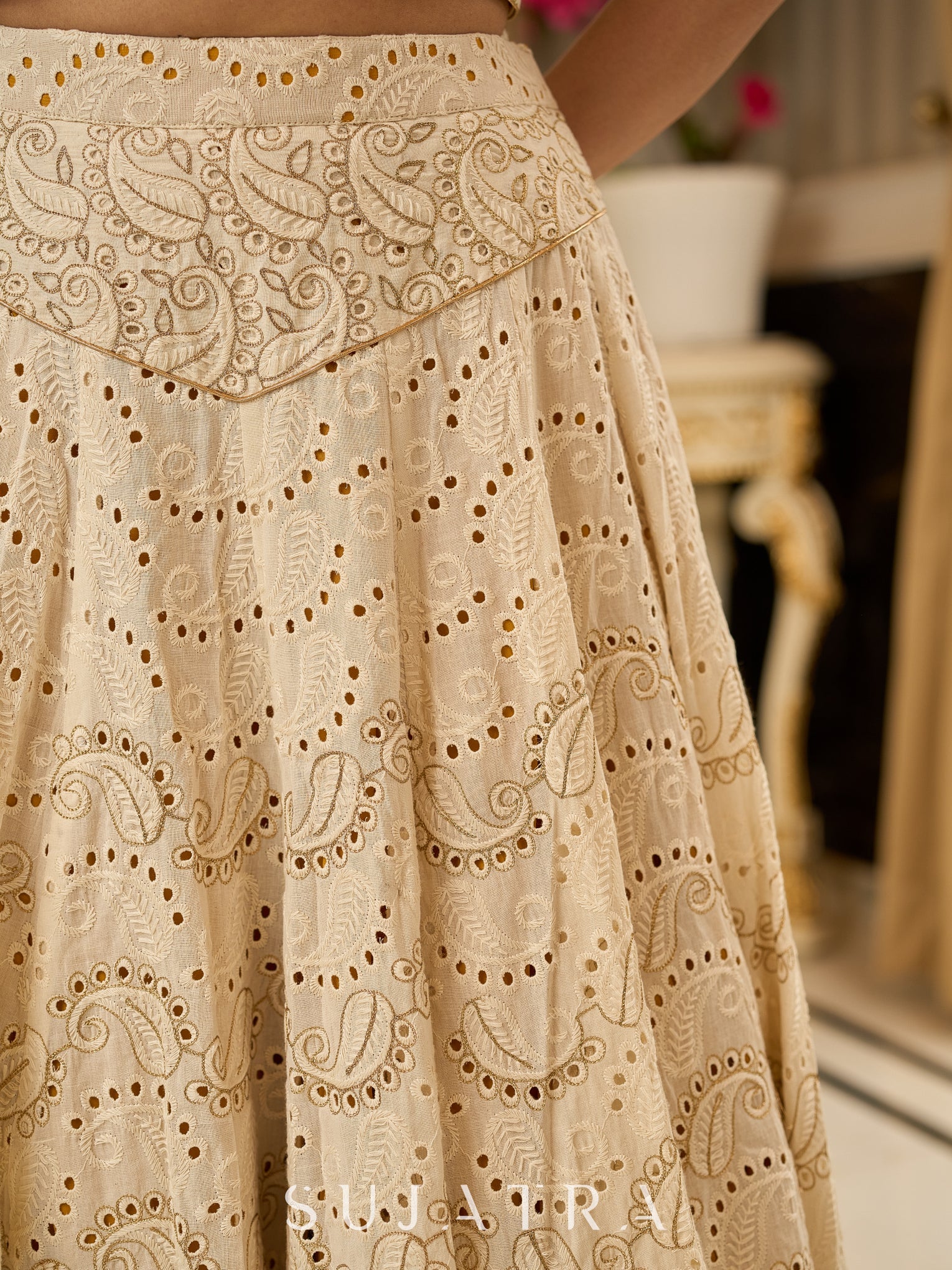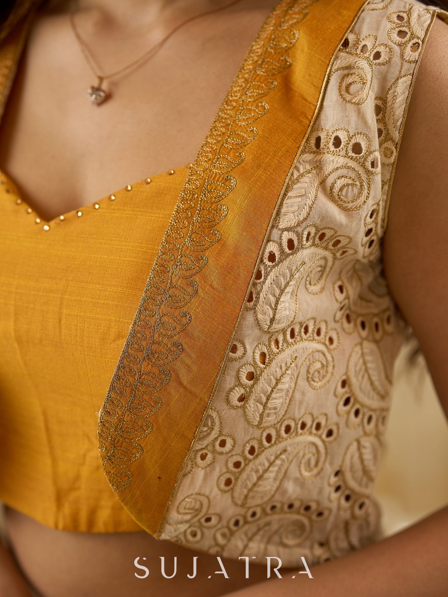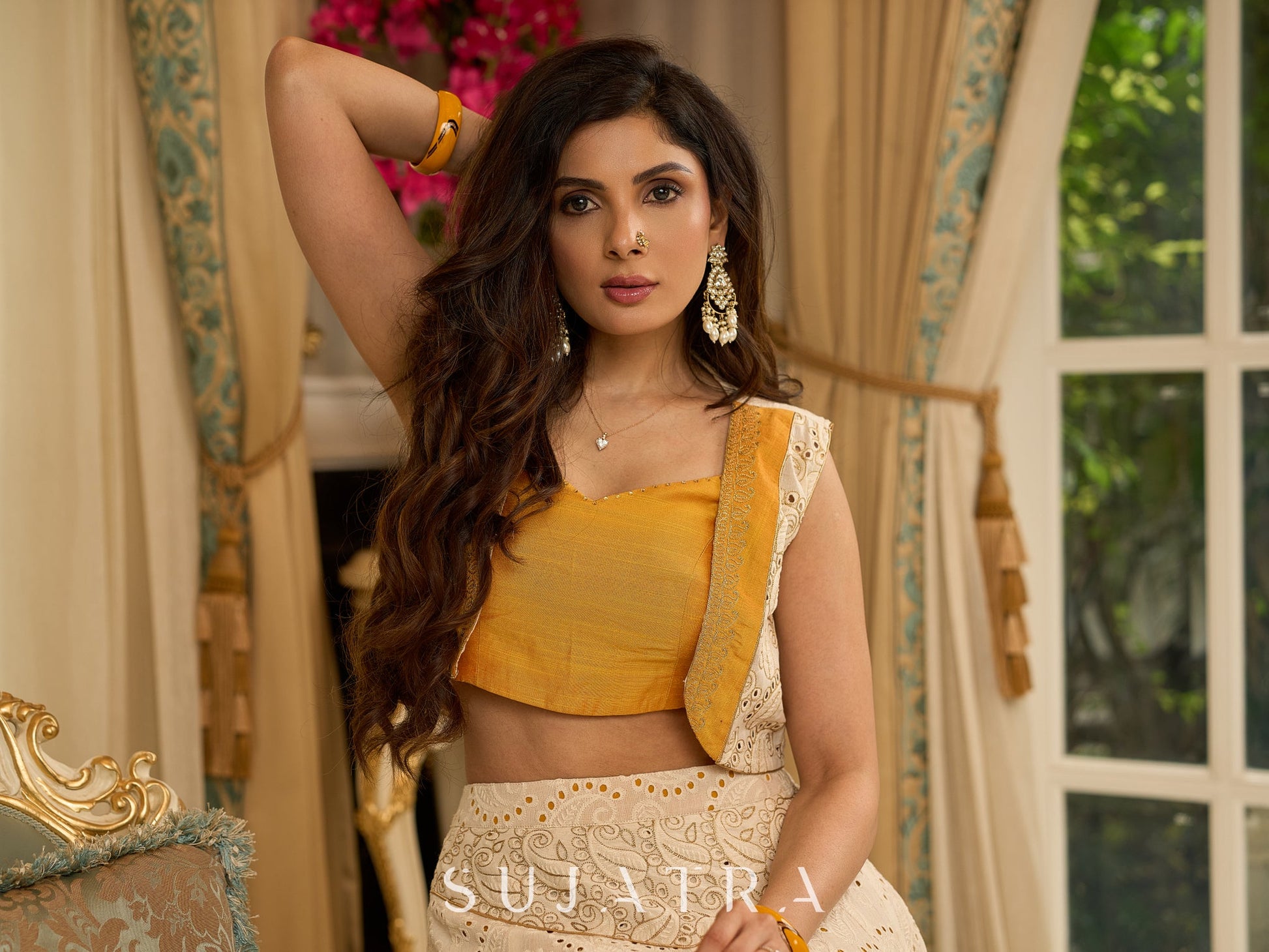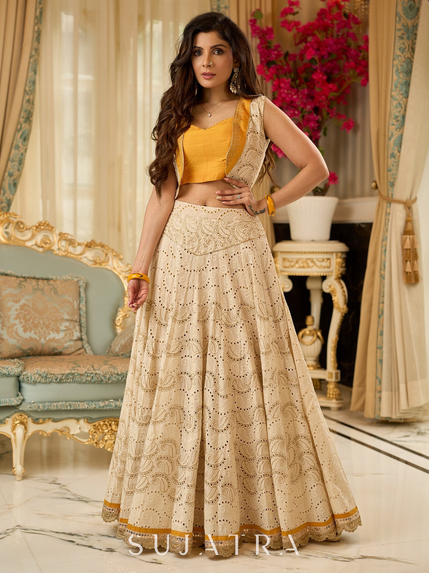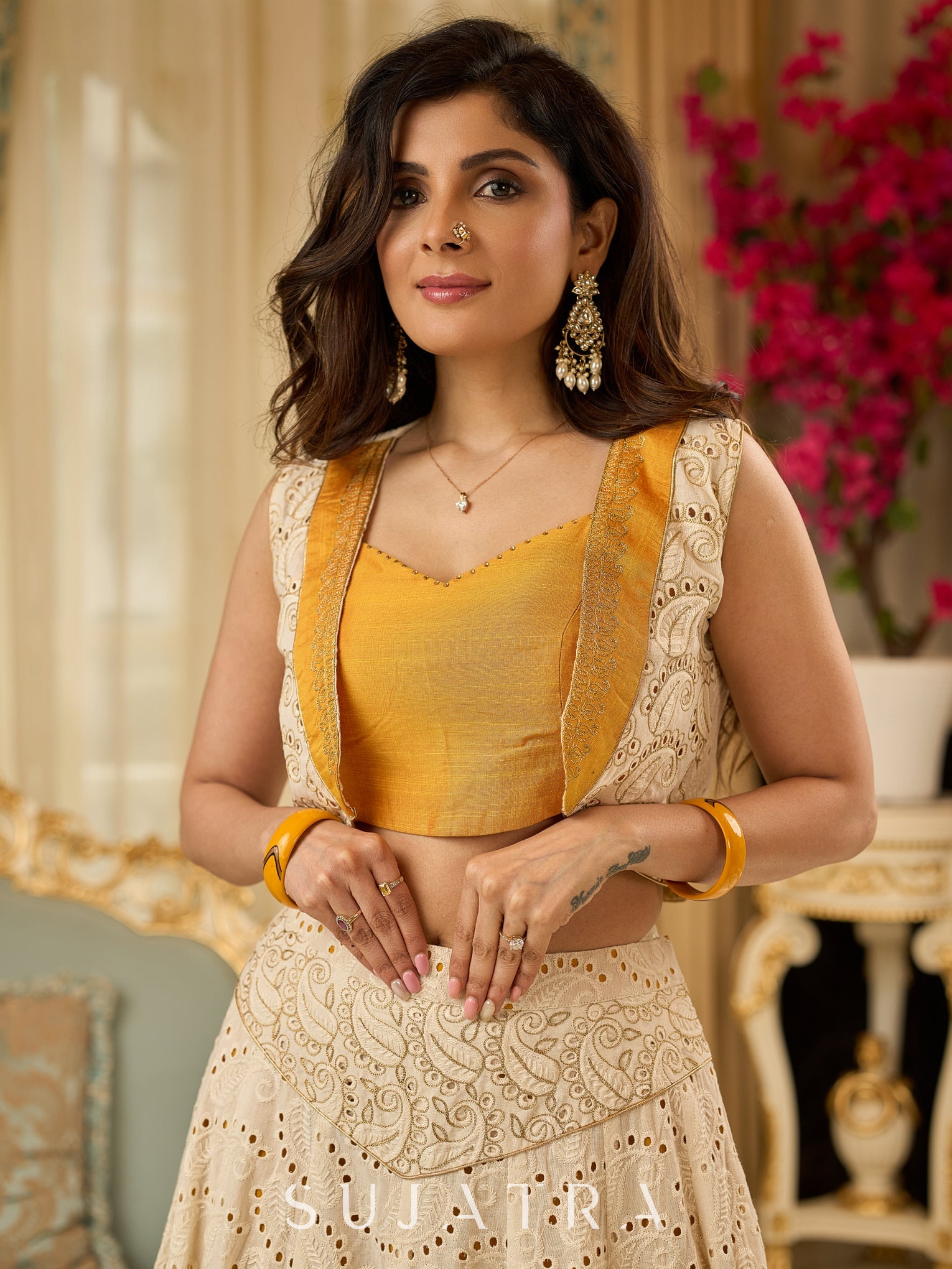 Introducing our chic off-white Hakoba Lehenga. Adorned with intricate gold embroidery, paired with a bold saffron yellow blouse and optional embroidered hakoba shrug. Elevate your ethnic wardrobe with this stylish ensemble.