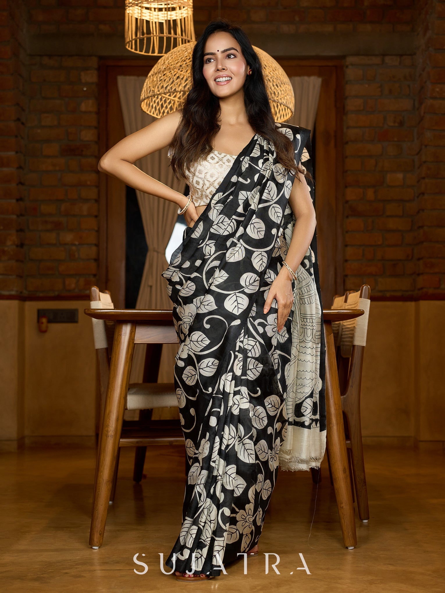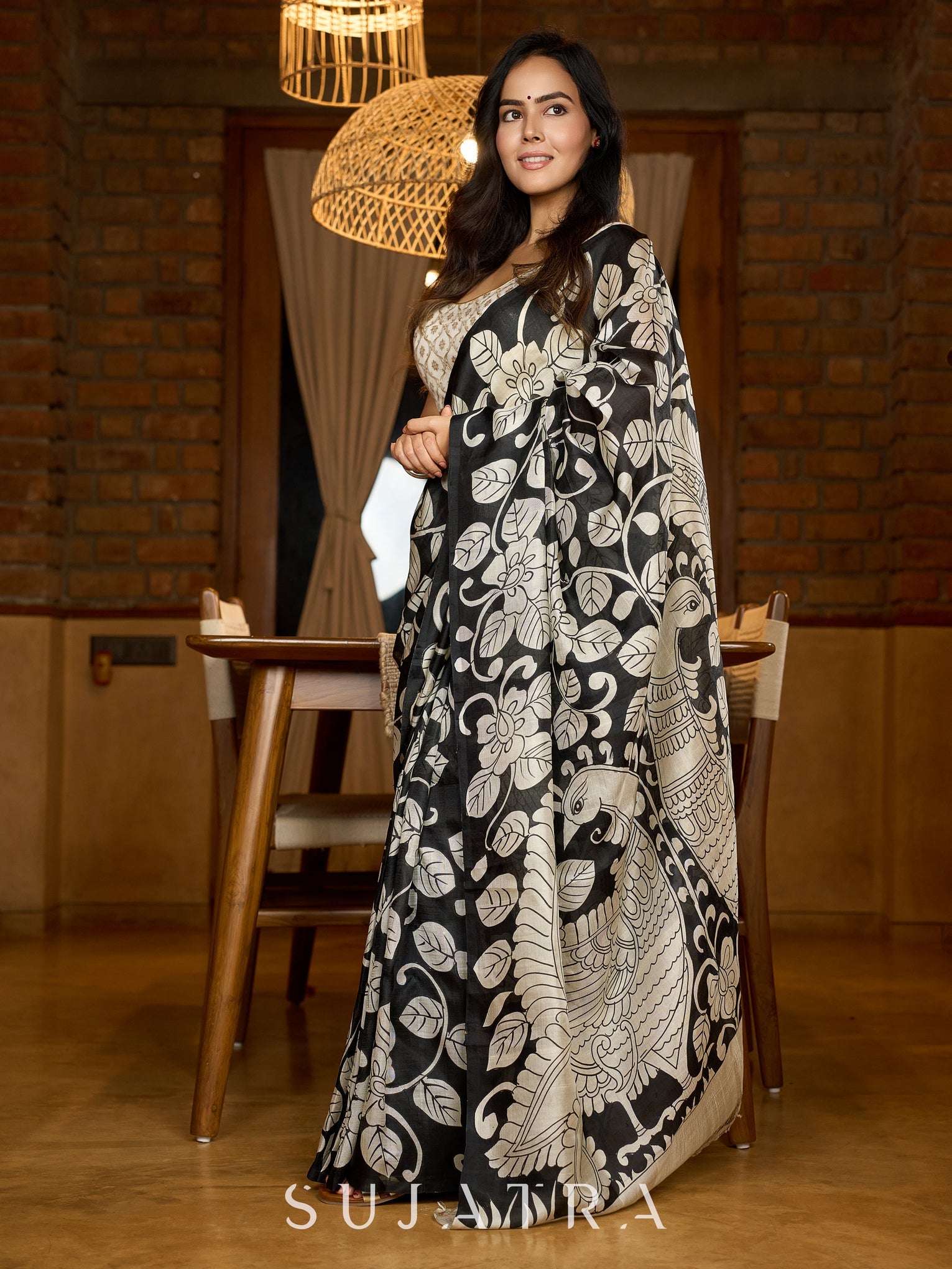 This elegant black silk saree boasts intricate hand-drawn Kalamkari style motifs, showcasing the craftsmanship and artistry of Indian textiles. Perfect for formal occasions, this saree adds a touch of sophistication and tradition to any outfit. The lightweight and luxurious fabric offers comfort and a timeless style.