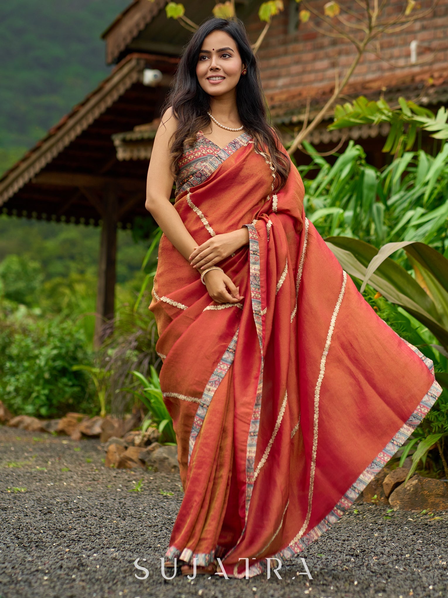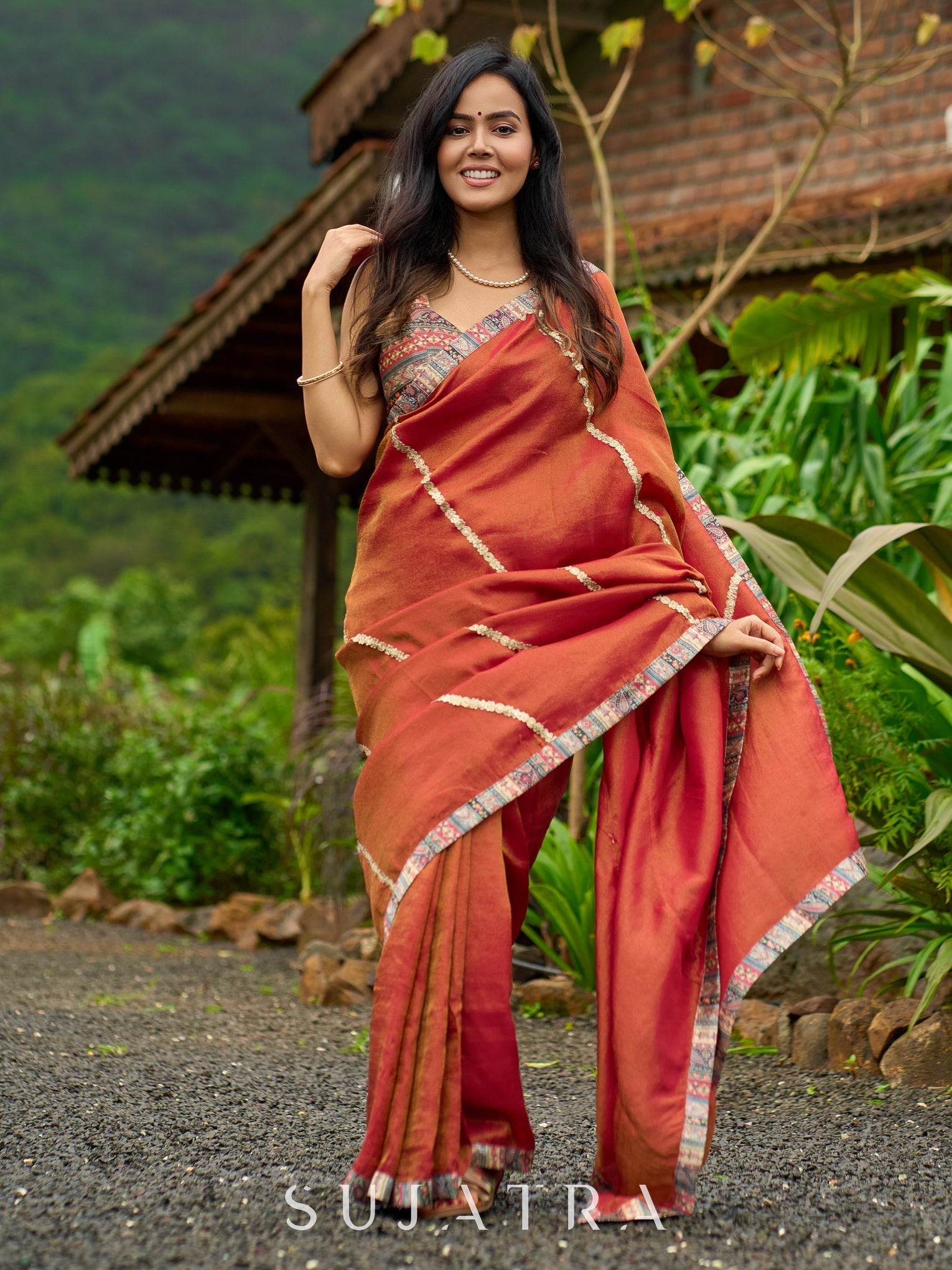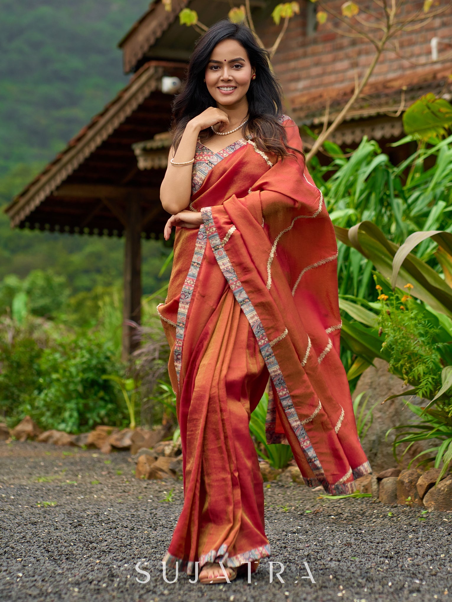 Elevate your style with our luxury burnt orange tissue saree. The shimmering zari highlights add a touch of sophistication to this timeless piece. Made with delicate tissue fabric, it's perfect for any special occasion. Experience true elegance and beauty with this stunning saree.