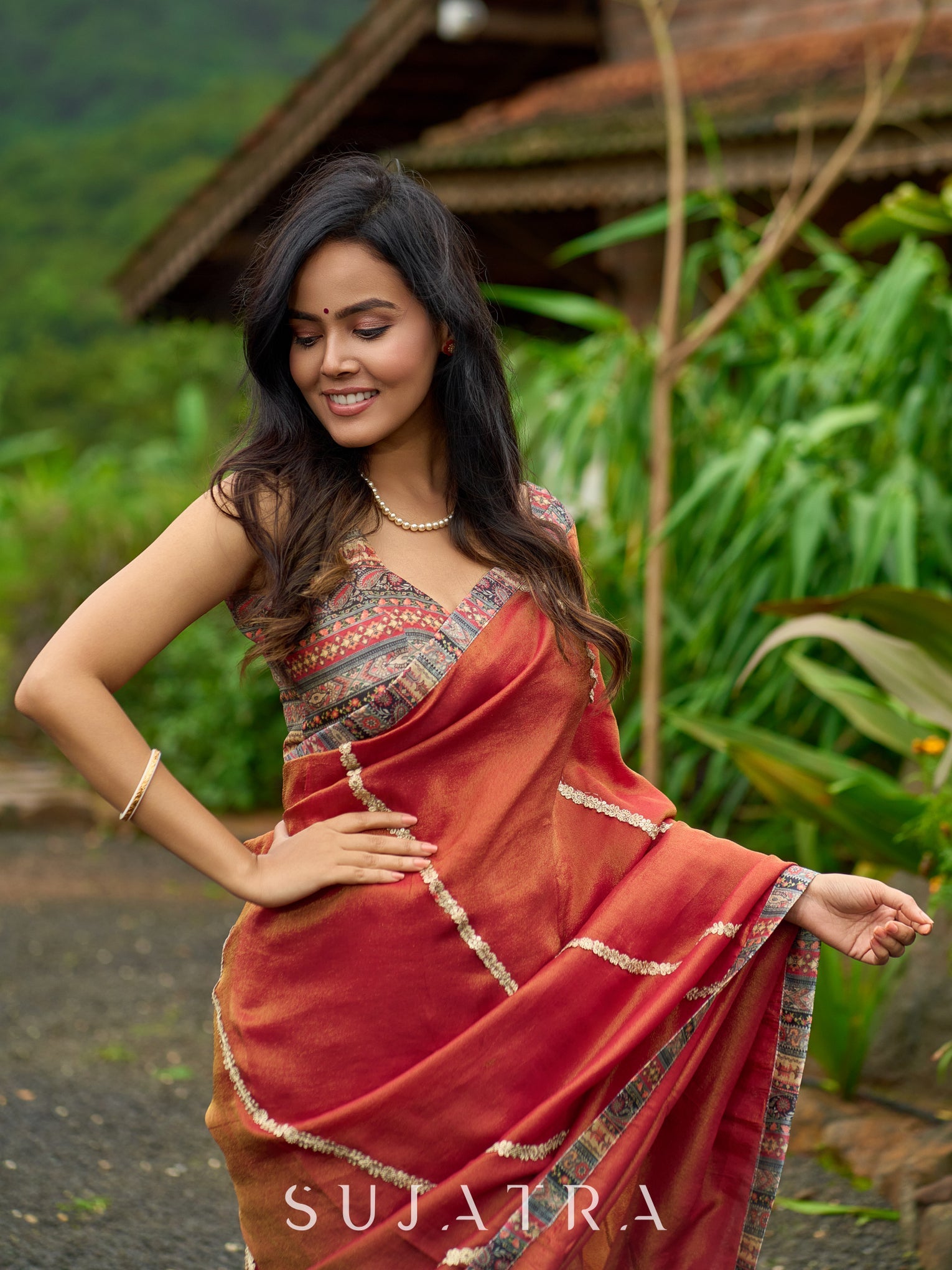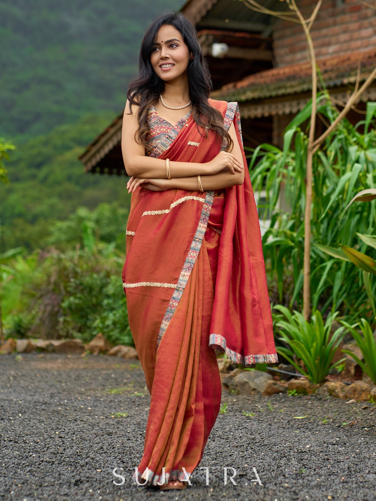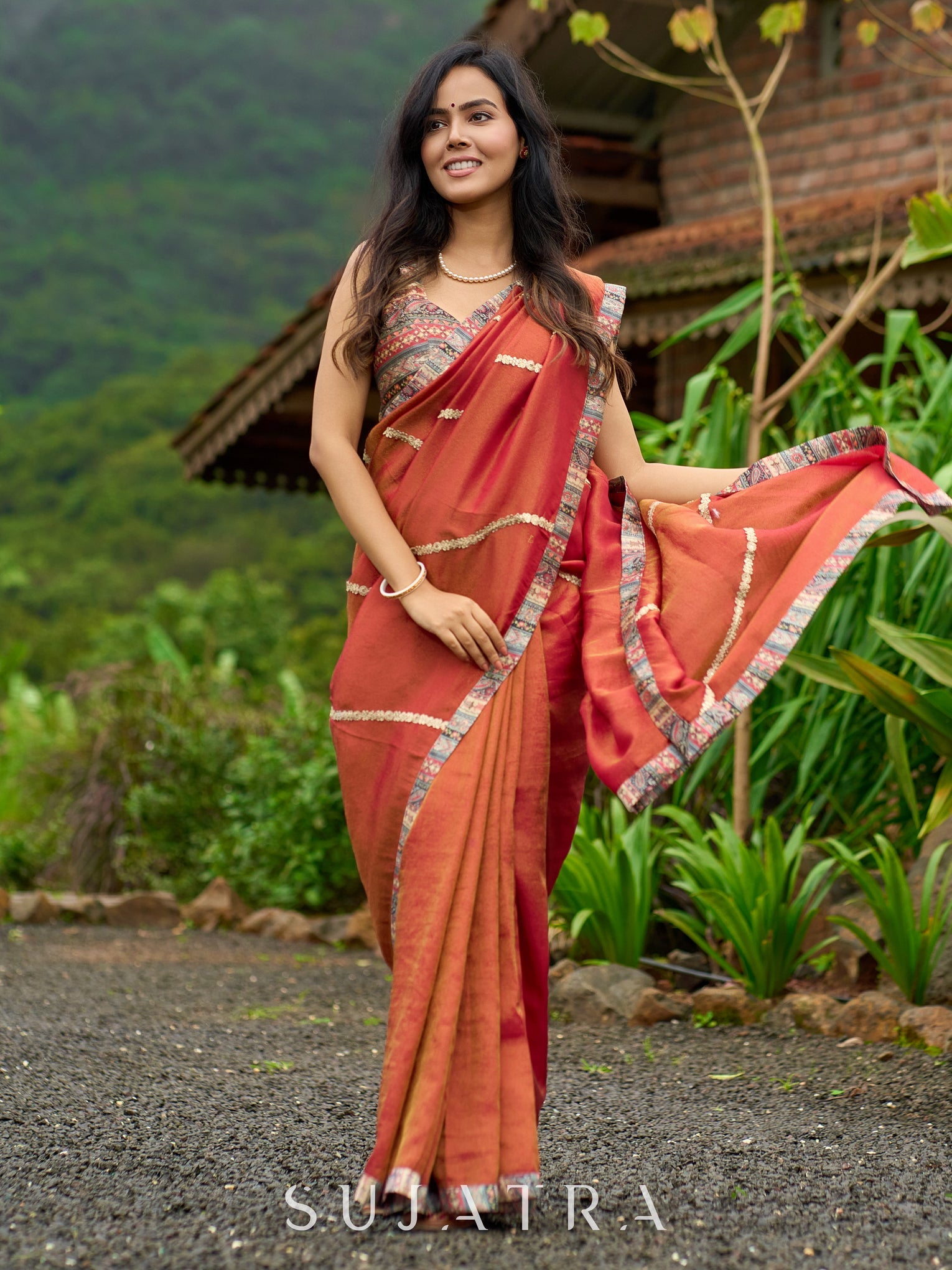 Elevate your style with our luxury burnt orange tissue saree. The shimmering zari highlights add a touch of sophistication to this timeless piece. Made with delicate tissue fabric, it's perfect for any special occasion. Experience true elegance and beauty with this stunning saree.