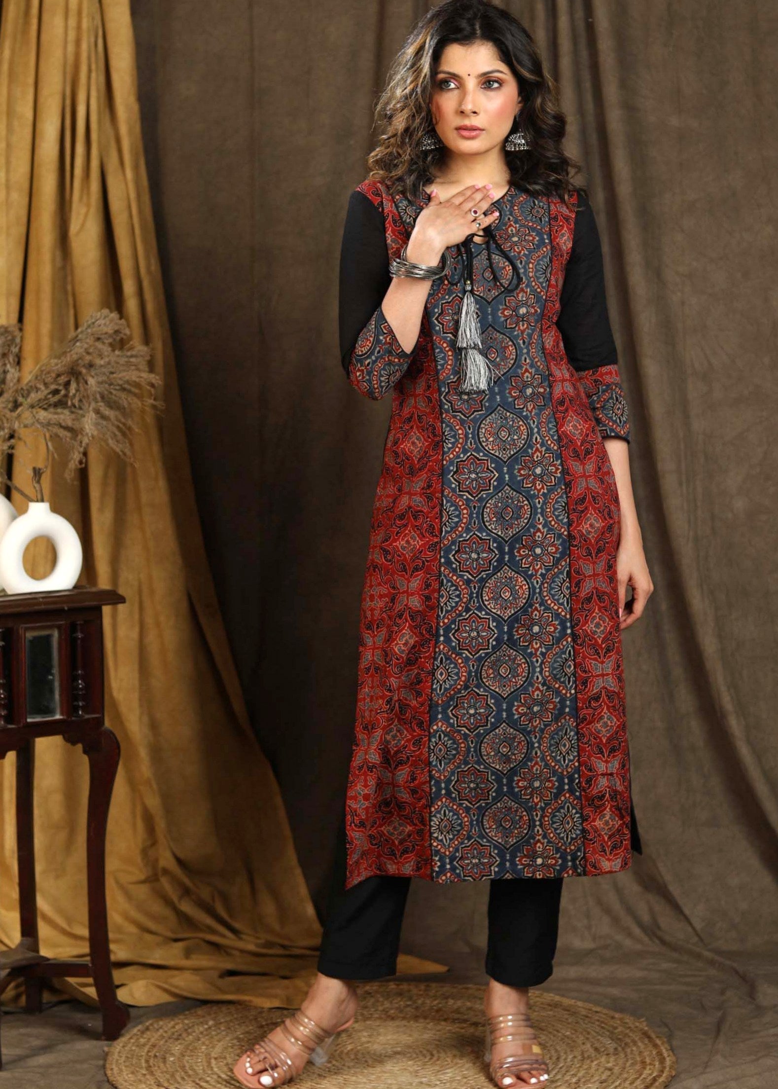 Beautiful Blue Ajrakh Staight Cut kurta with Rust Maroon Panel - Pant Optional