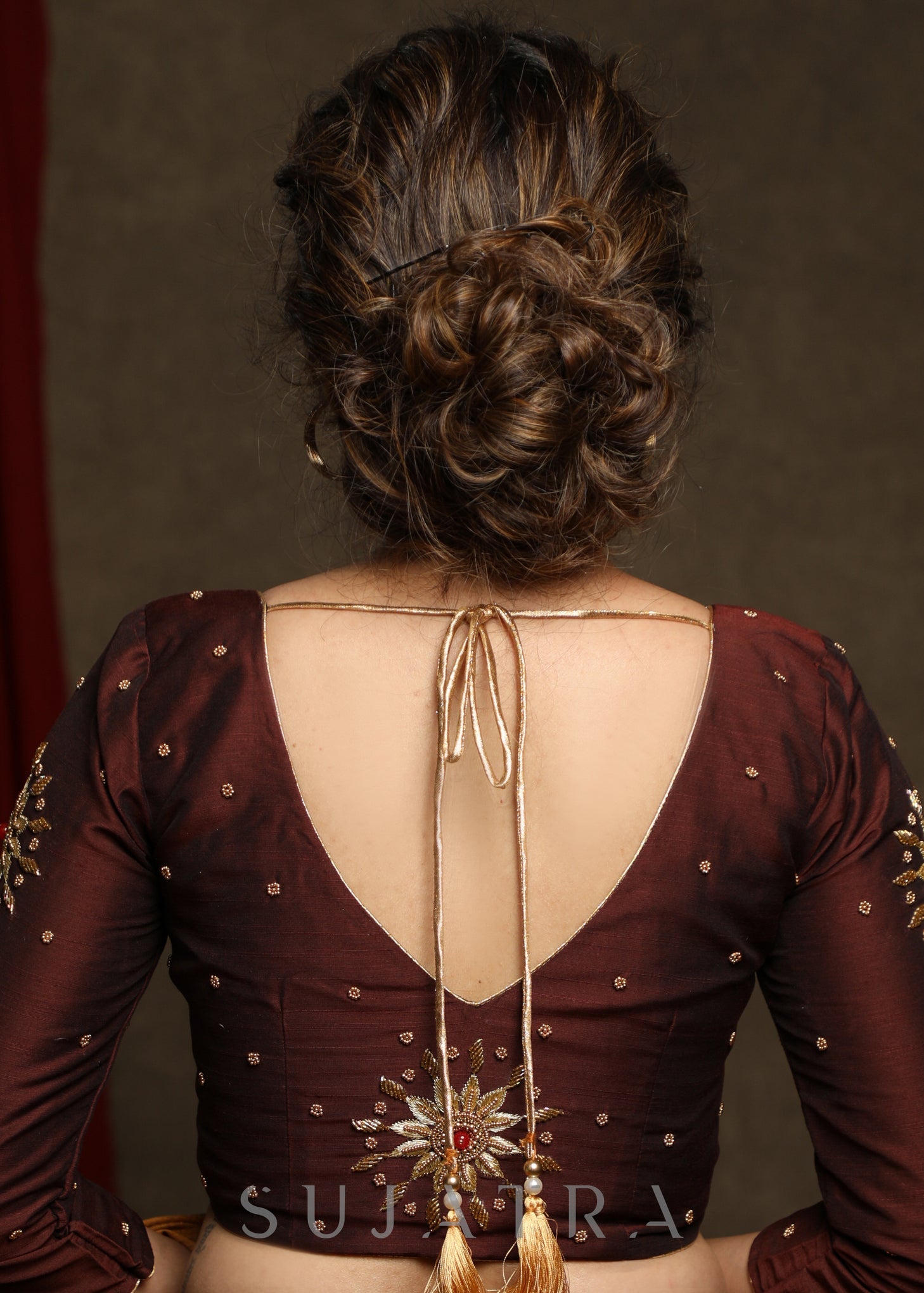 Add a touch of whimsy to your wardrobe with this beautifully hand-embroidered coffee brown blouse. Made with a luxurious blend of cotton and silk, it's perfect for any special occasion. Embrace your playful side with this unique and stylish piece. (Only 33 words!)