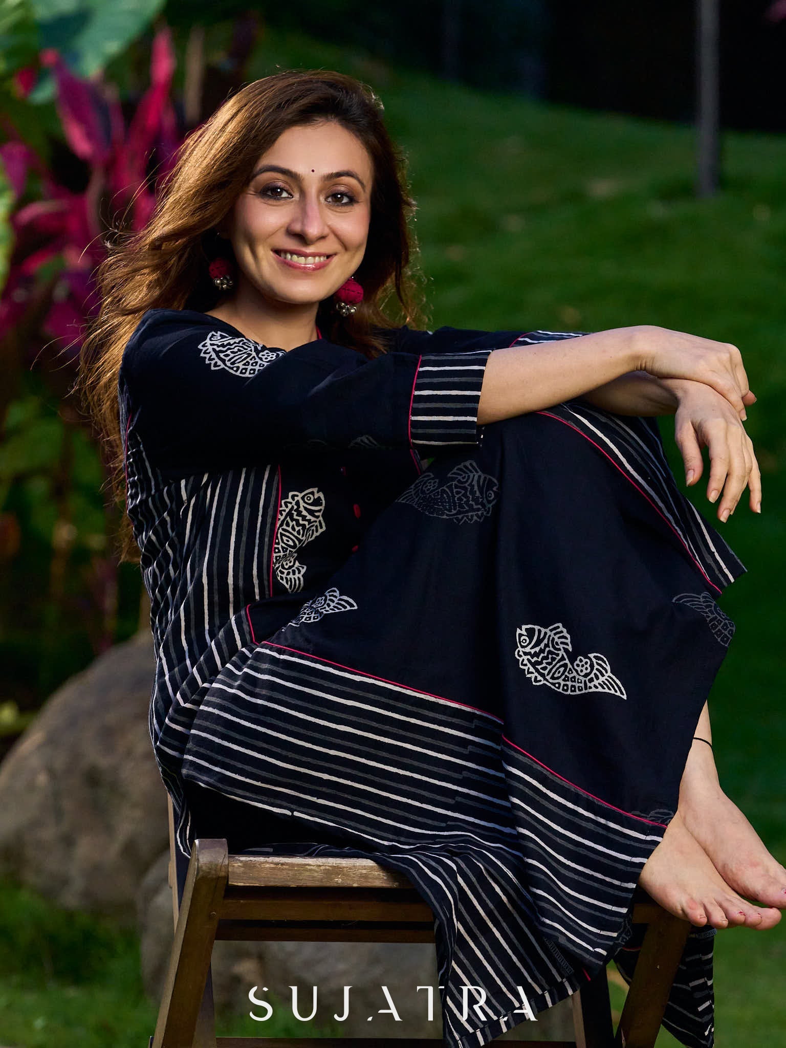 Black Cotton Kurta with Fish Print and Striped Panels Accentuated with Magenta Highlights