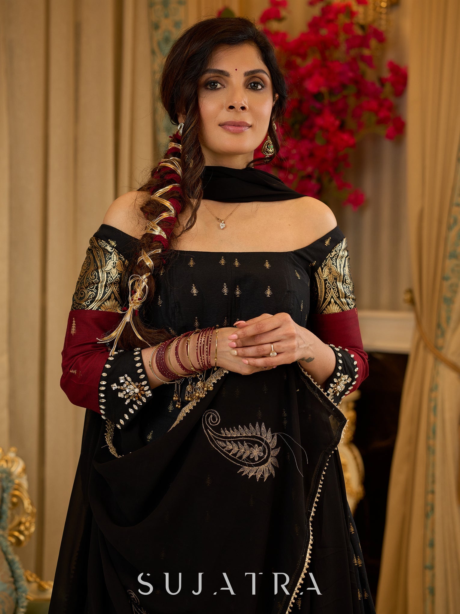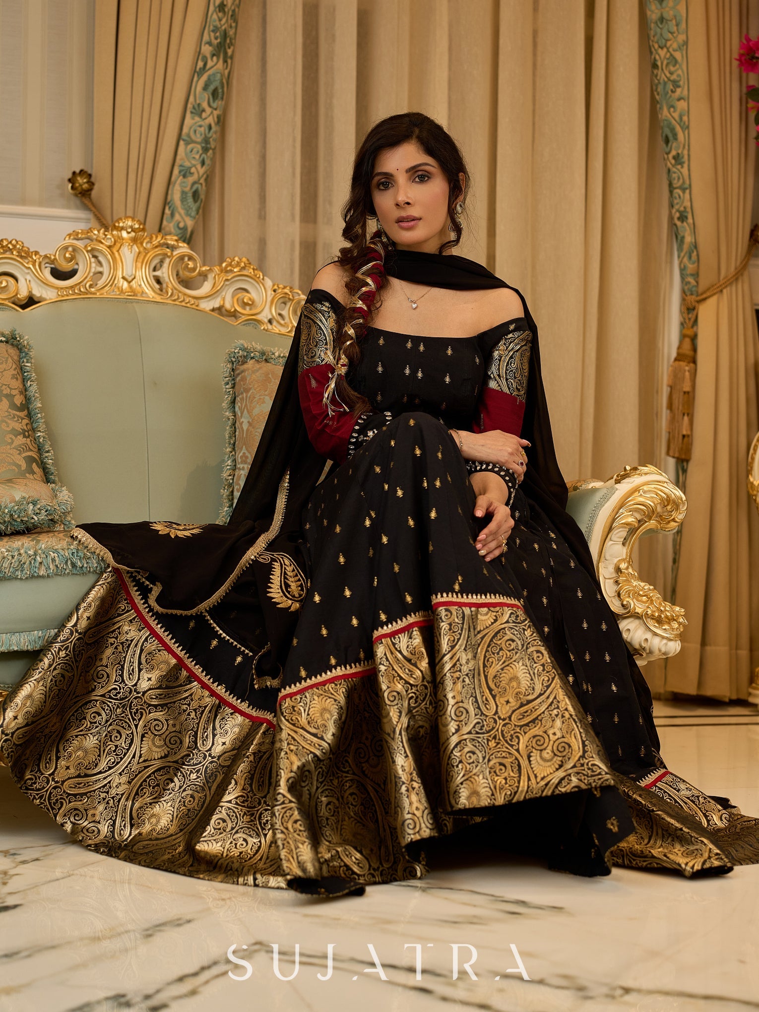 Crafted with a blend of luxurious black cotton silk and brocade, this lehenga is paired with a sculpted corset style choli featuring intricate stonework on the sleeves. This ensemble is perfect for special occasions, offering both elegance and comfort. Elevate your wardrobe with this stunning piece.