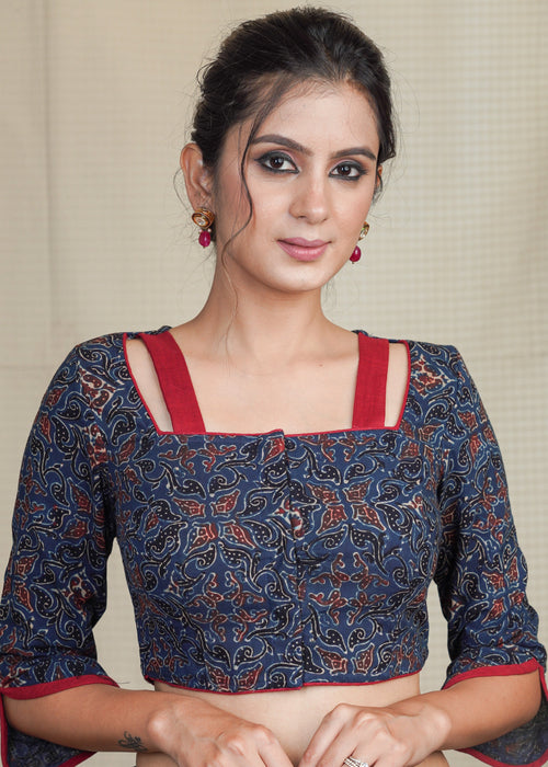 This blue cotton silk blouse combines elegance with contemporary design, featuring a smart crop top silhouette. The standout detail is the flared laced designer sleeve on the right side, adding a unique and sophisticated touch. Crafted from breathable cotton silk, it ensures comfort while maintaining a polished look, perfect for stylish occasions or pairing with traditional and modern outfits alike.