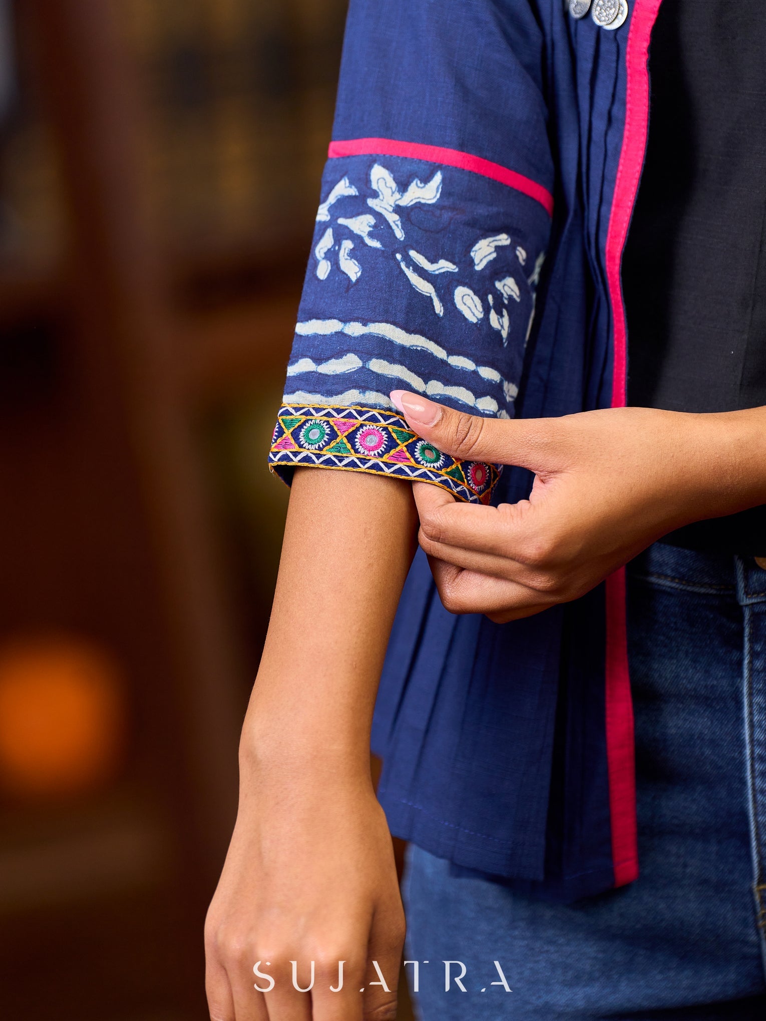 Bohemian Indigo Cotton Jacket Adorned With Pleats, Vibrant Mirror Lace And Pink Accents