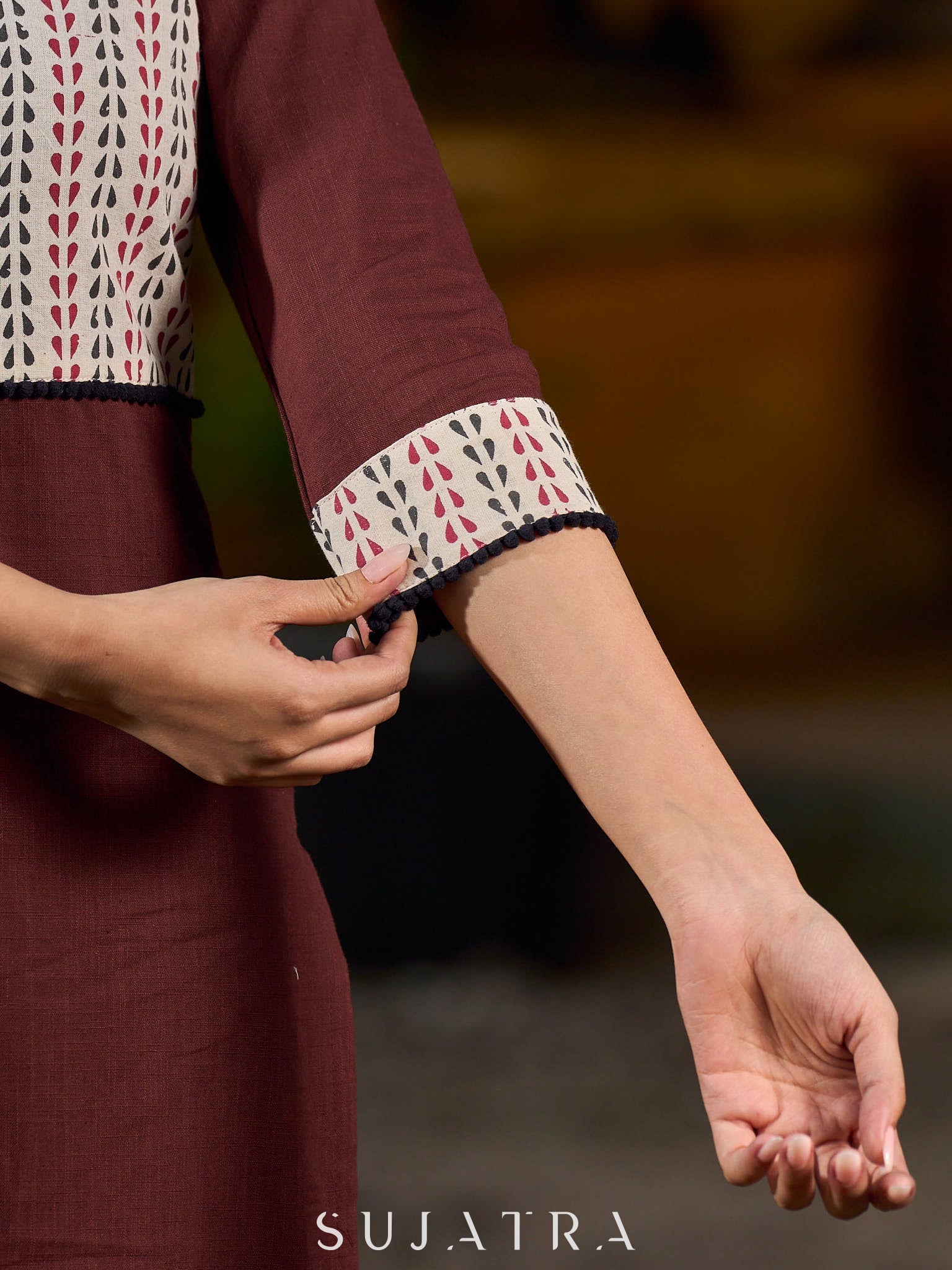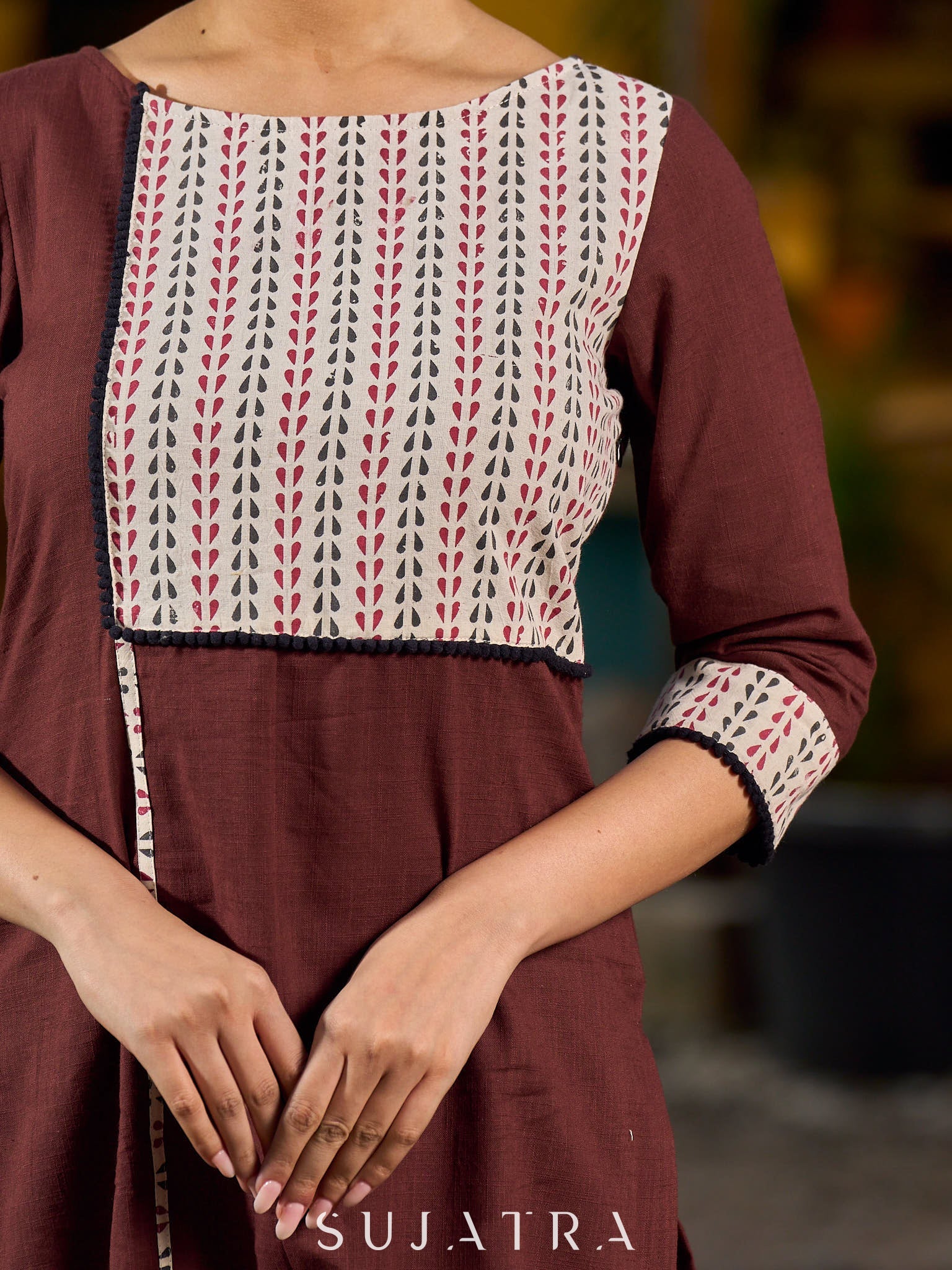 Brown cotton straight kurta with white Ajrakh patch and black accents.