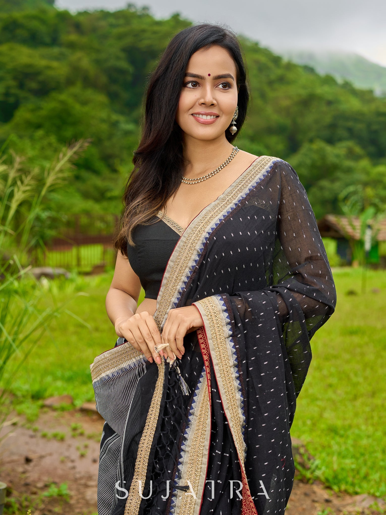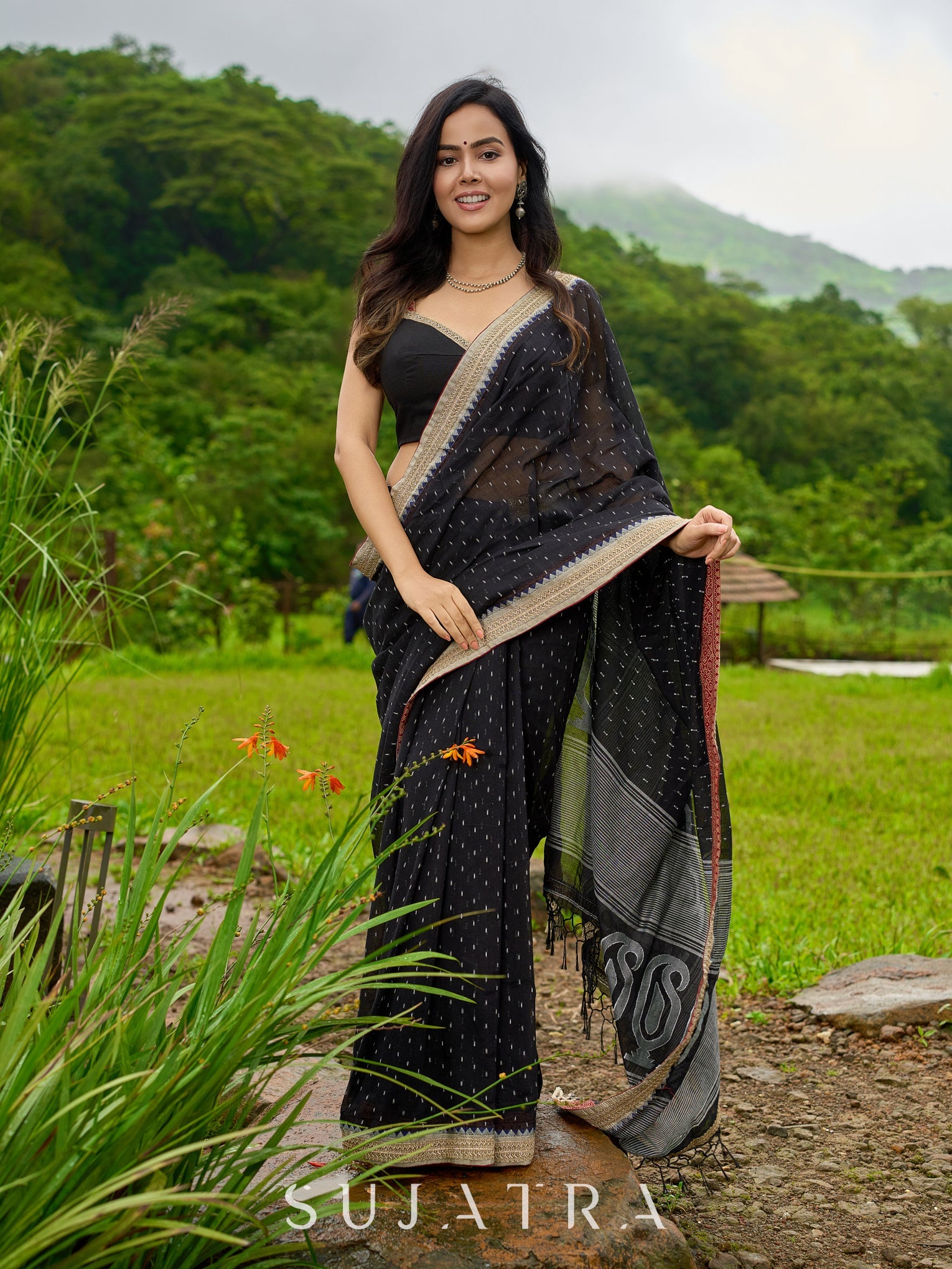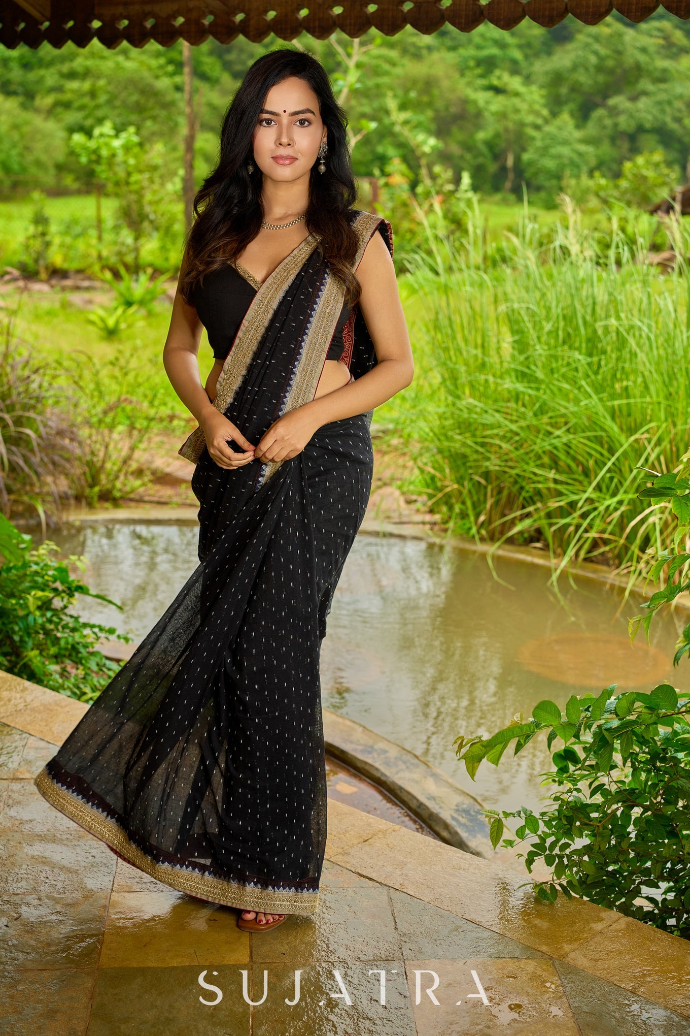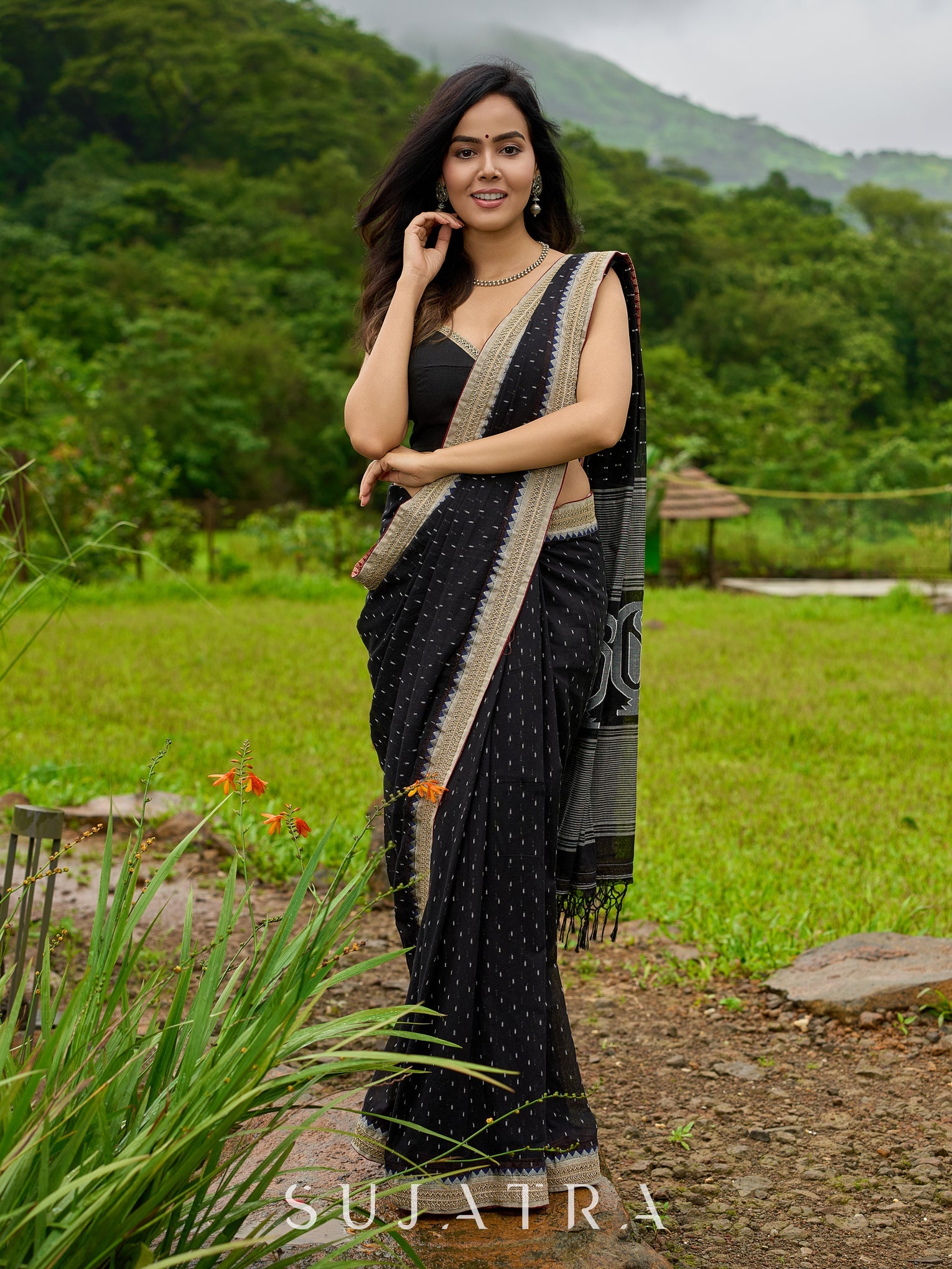 Classic black cotton saree featuring intricate weave and radiant zari edges
