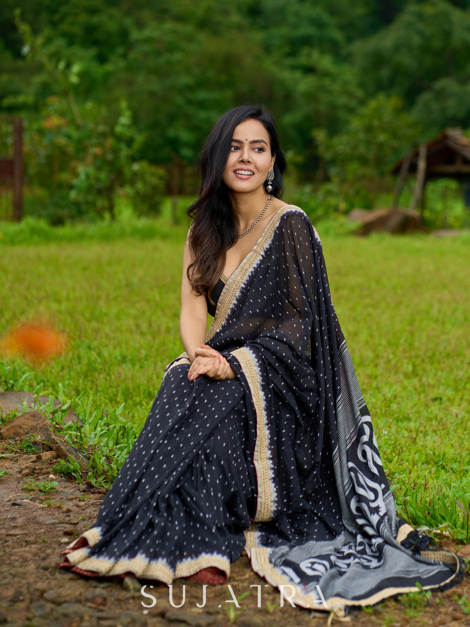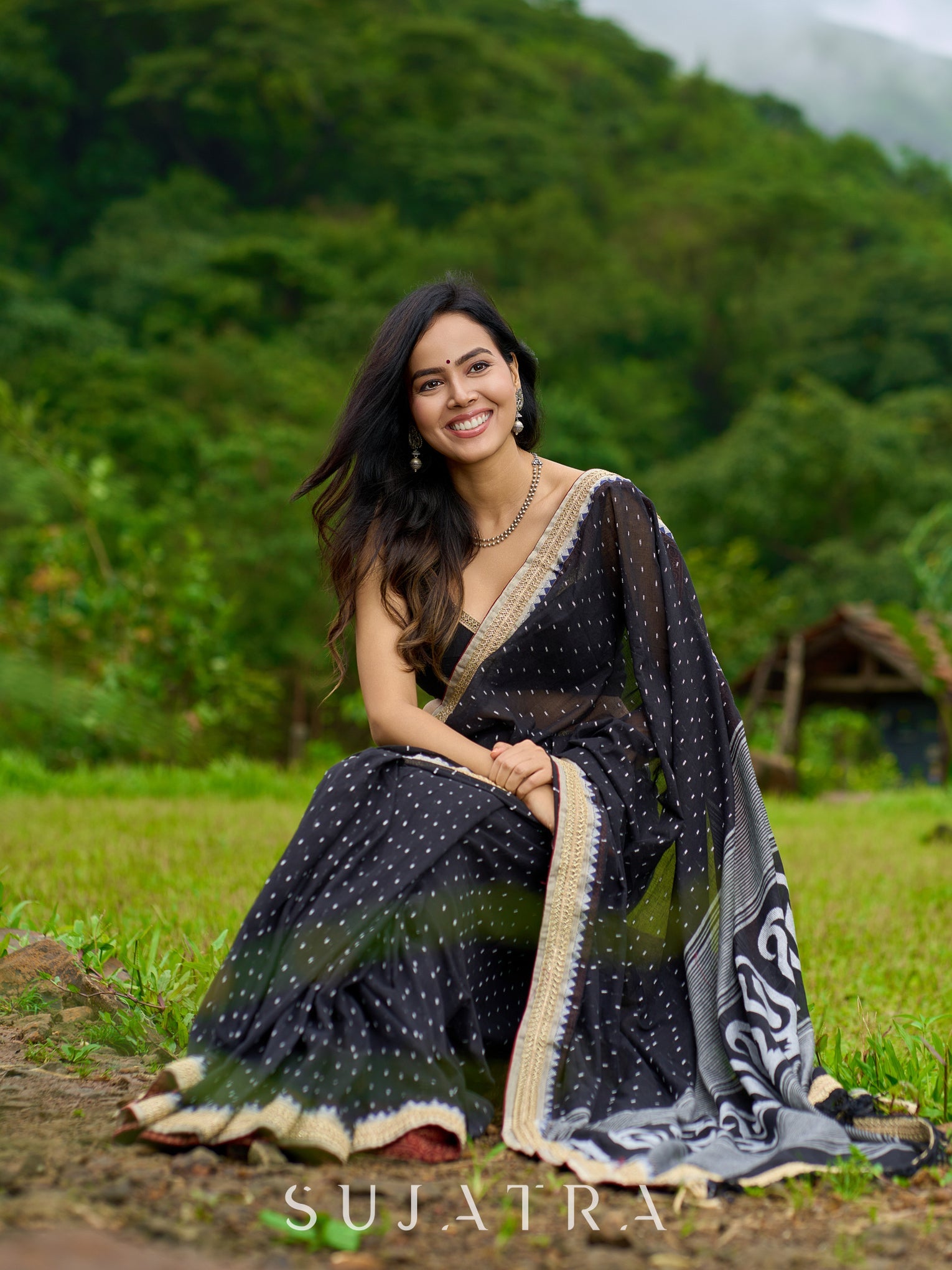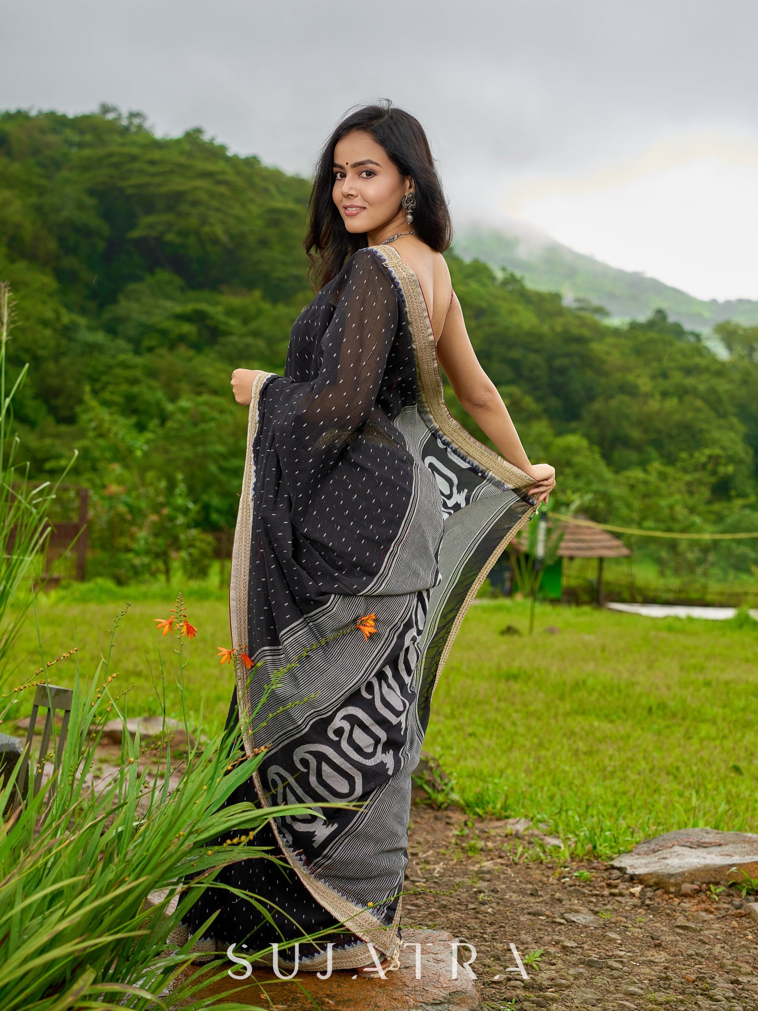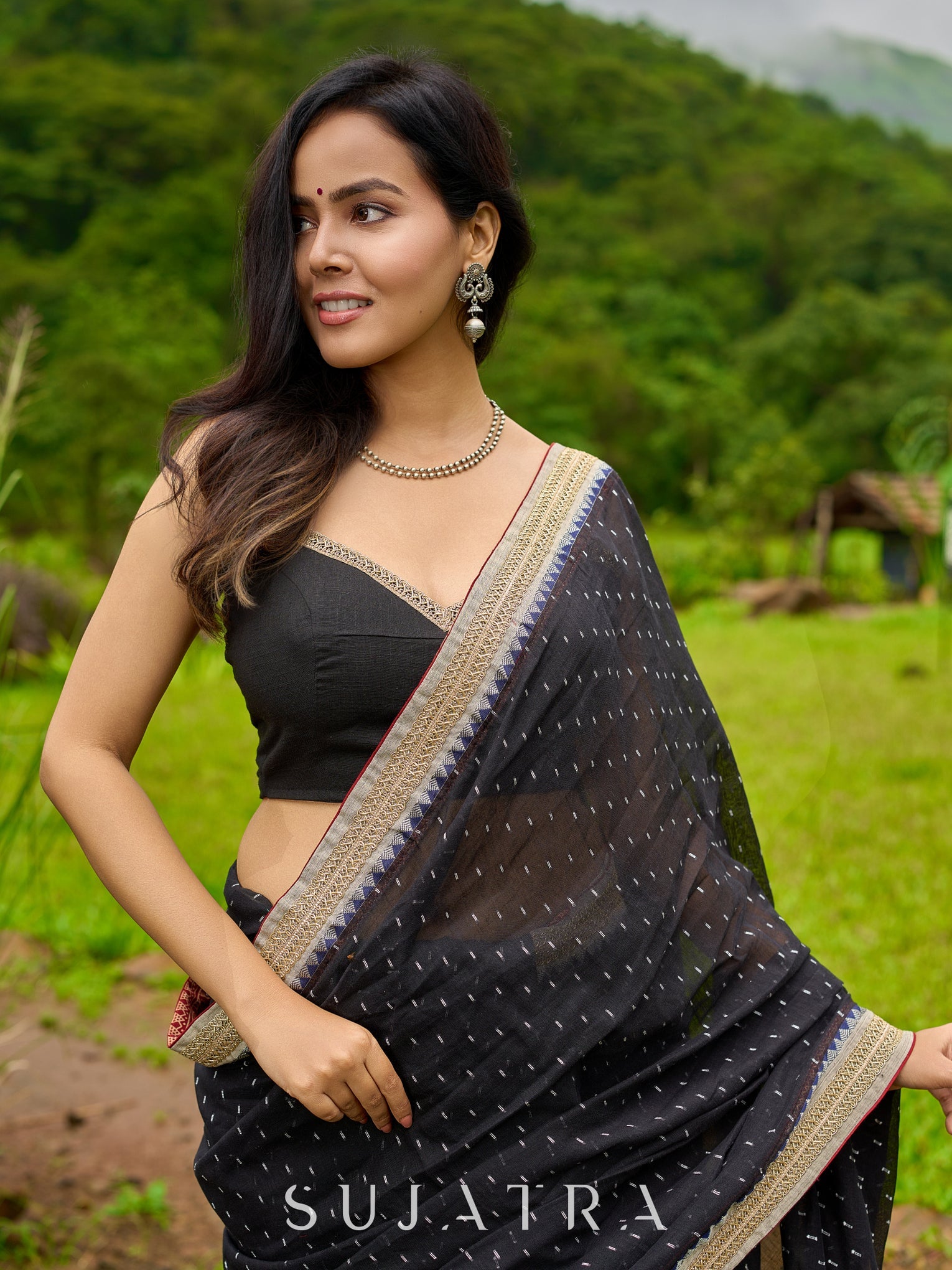 Classic black cotton saree featuring intricate weave and radiant zari edges