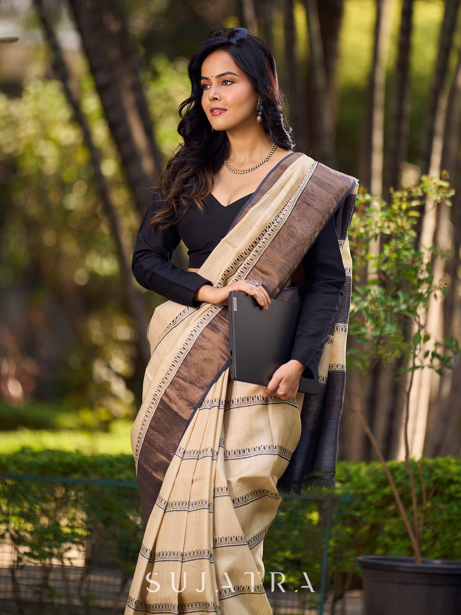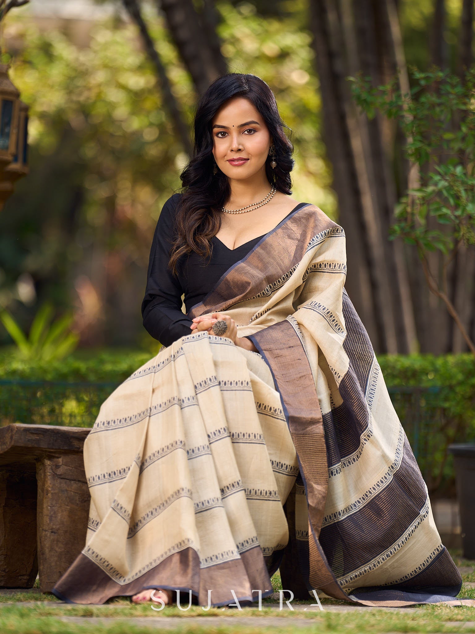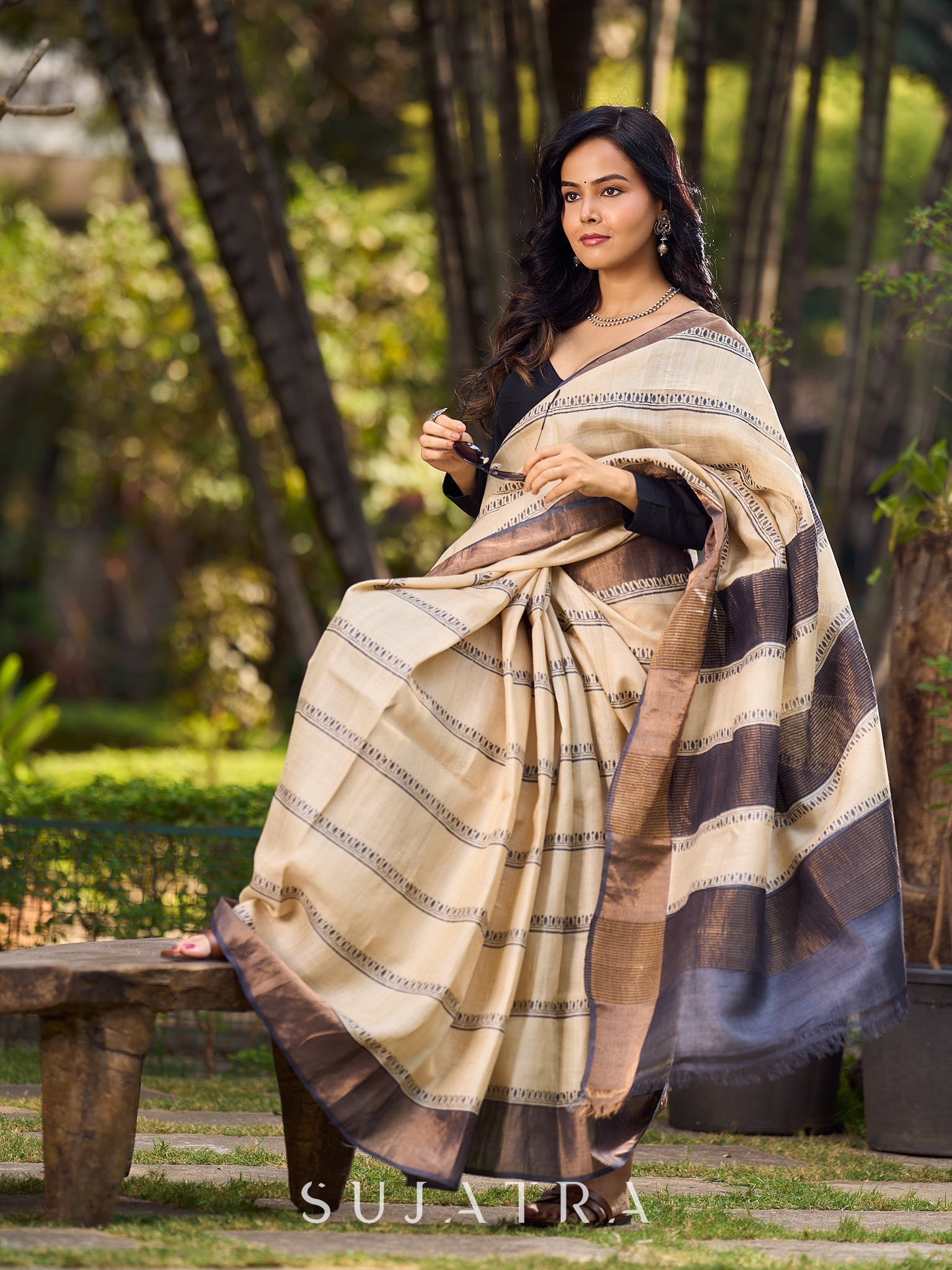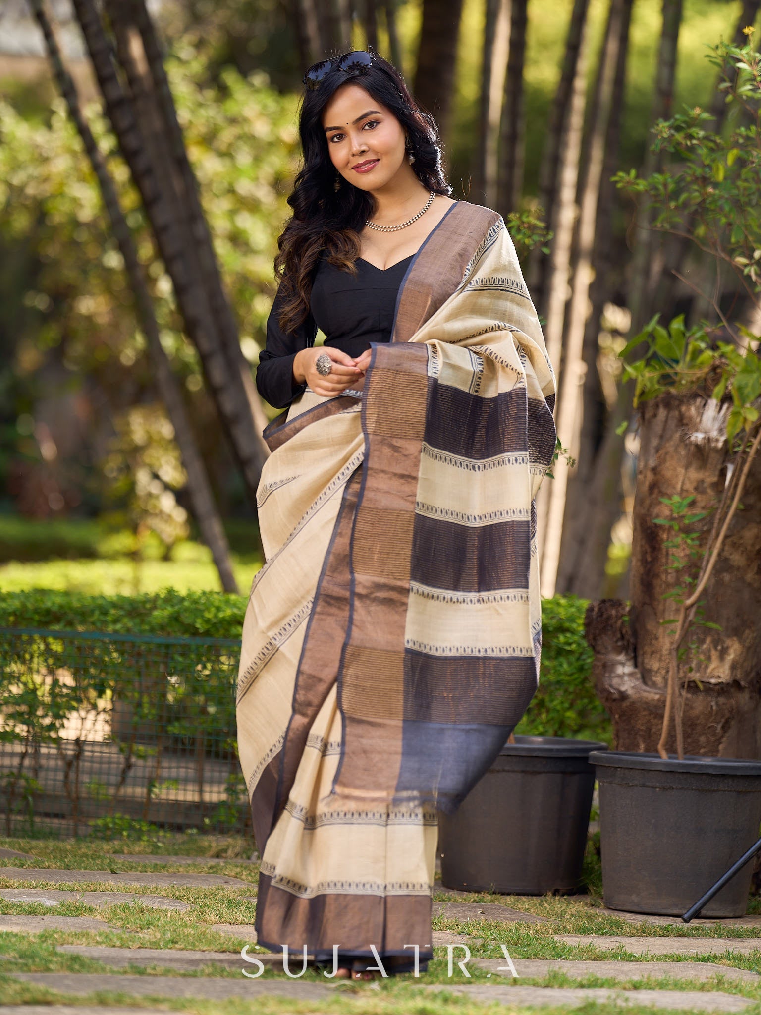Classic Ivory and Brown Pure Tussar Silk Block Printed Saree Accented with Subtle Stripes and Handcrafted Detailing