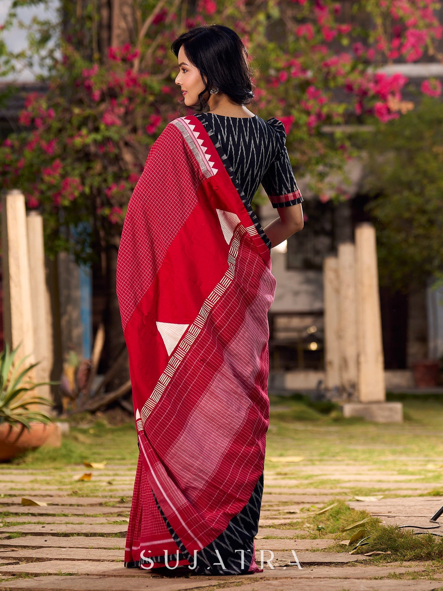 Classic Red Checkered Cotton Saree with Black Ikat Border