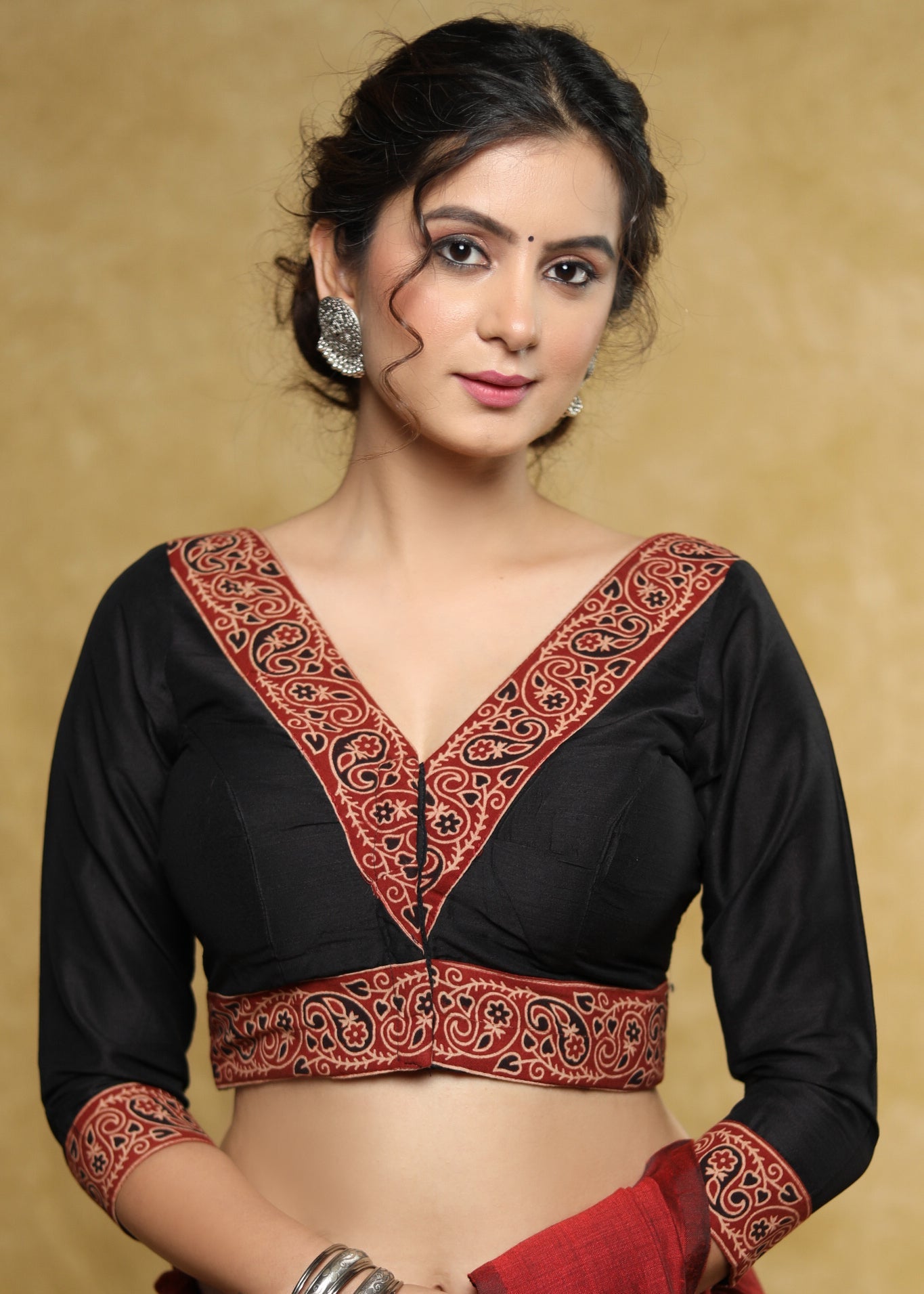 Elevate your ethnic wardrobe with this elegant black cotton-silk blouse, featuring intricate maroon Ajrakh detailing that adds a refined touch. Designed with a stylish dori at the back, it offers both comfort and a customizable fit. Perfectly suited to complement plain sarees, this blouse blends traditional craftsmanship with contemporary sophistication.