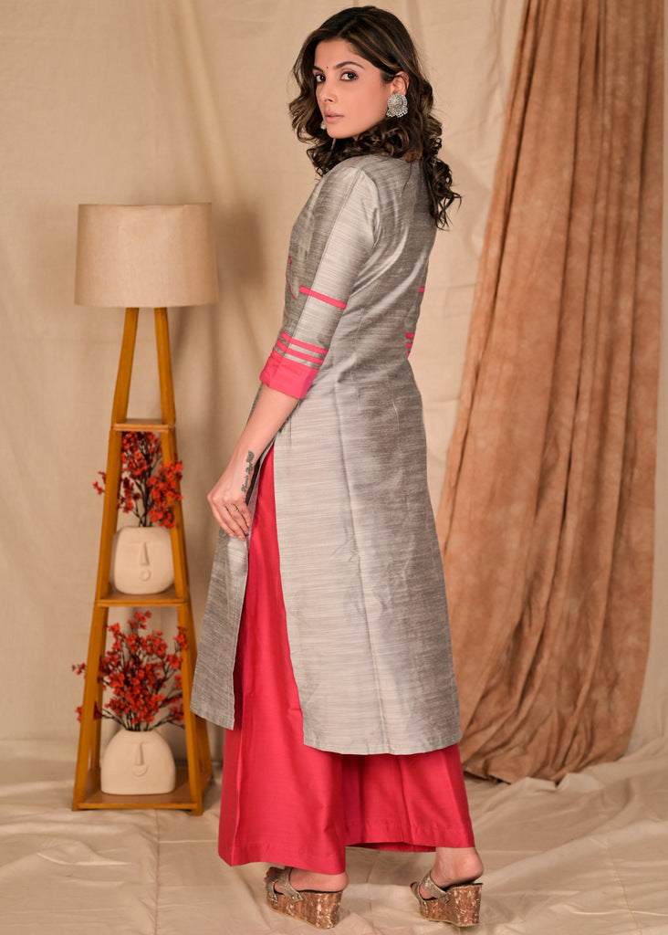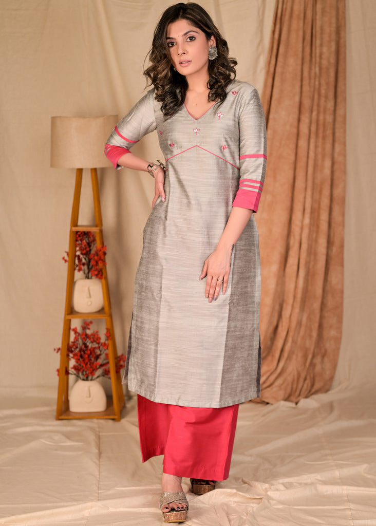 Classy Grey Cotton Silk Kurta with Hand Embroidered Lotus Motif on Yoke and Contrast Detailing - Palazzo Optional