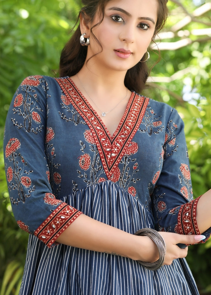This Classy Indigo and Ajrakh V-Neck Fit and Flare Dress effortlessly combines a timeless V-neck design with the intricate and traditional patterns of Ajrakh. Its fit and flare silhouette flatters any body type, making it a versatile and elegant choice for any occasion. Embrace the rich history of Ajrakh with this beautiful dress.
