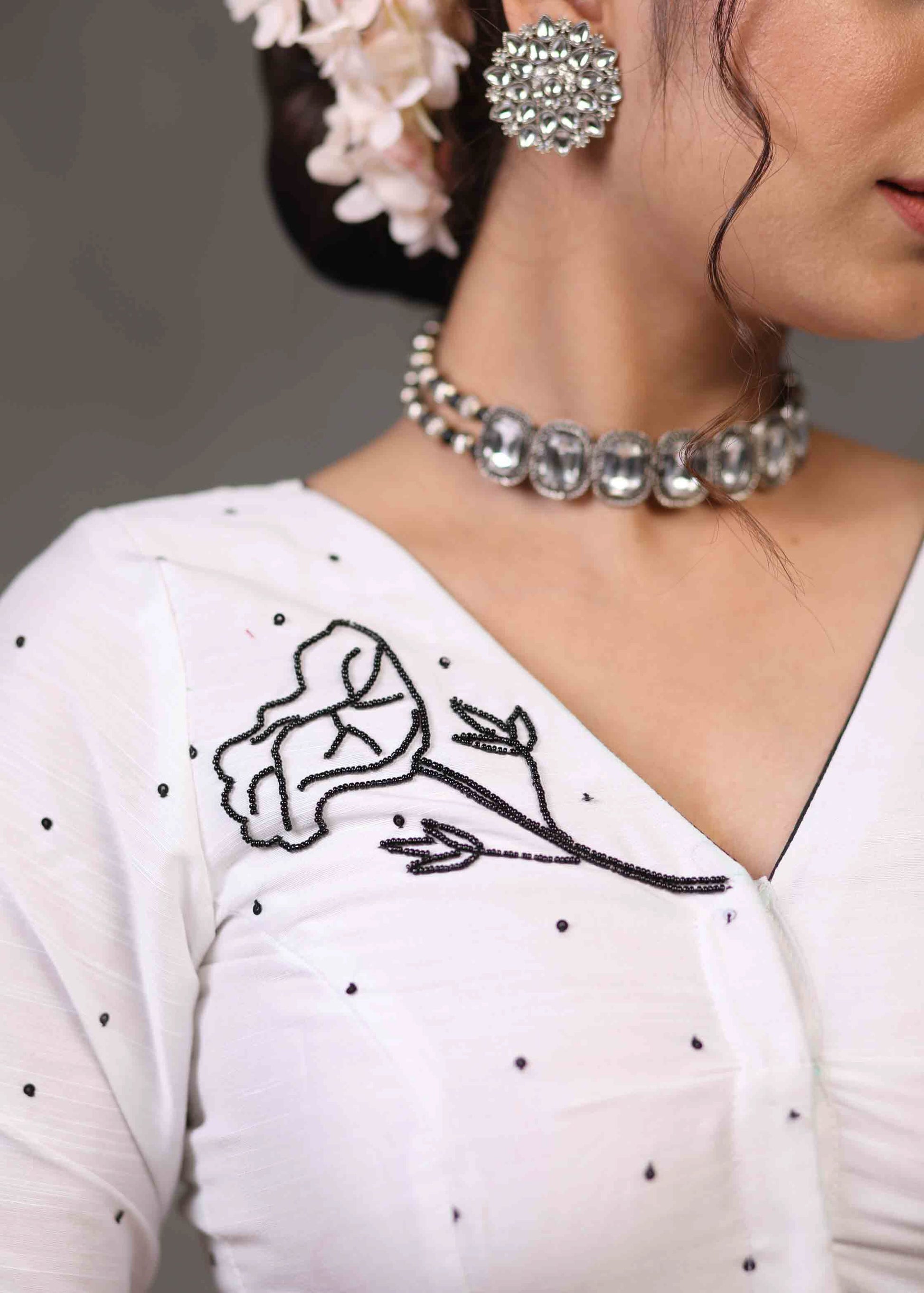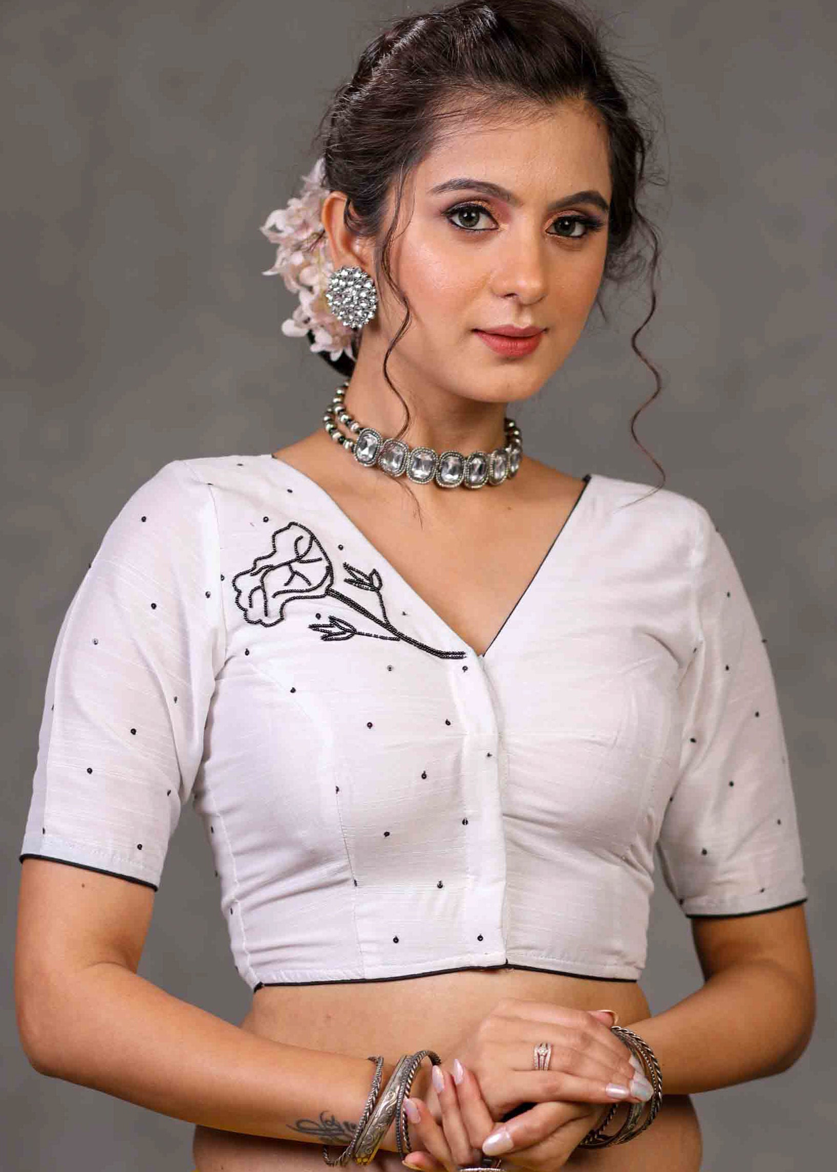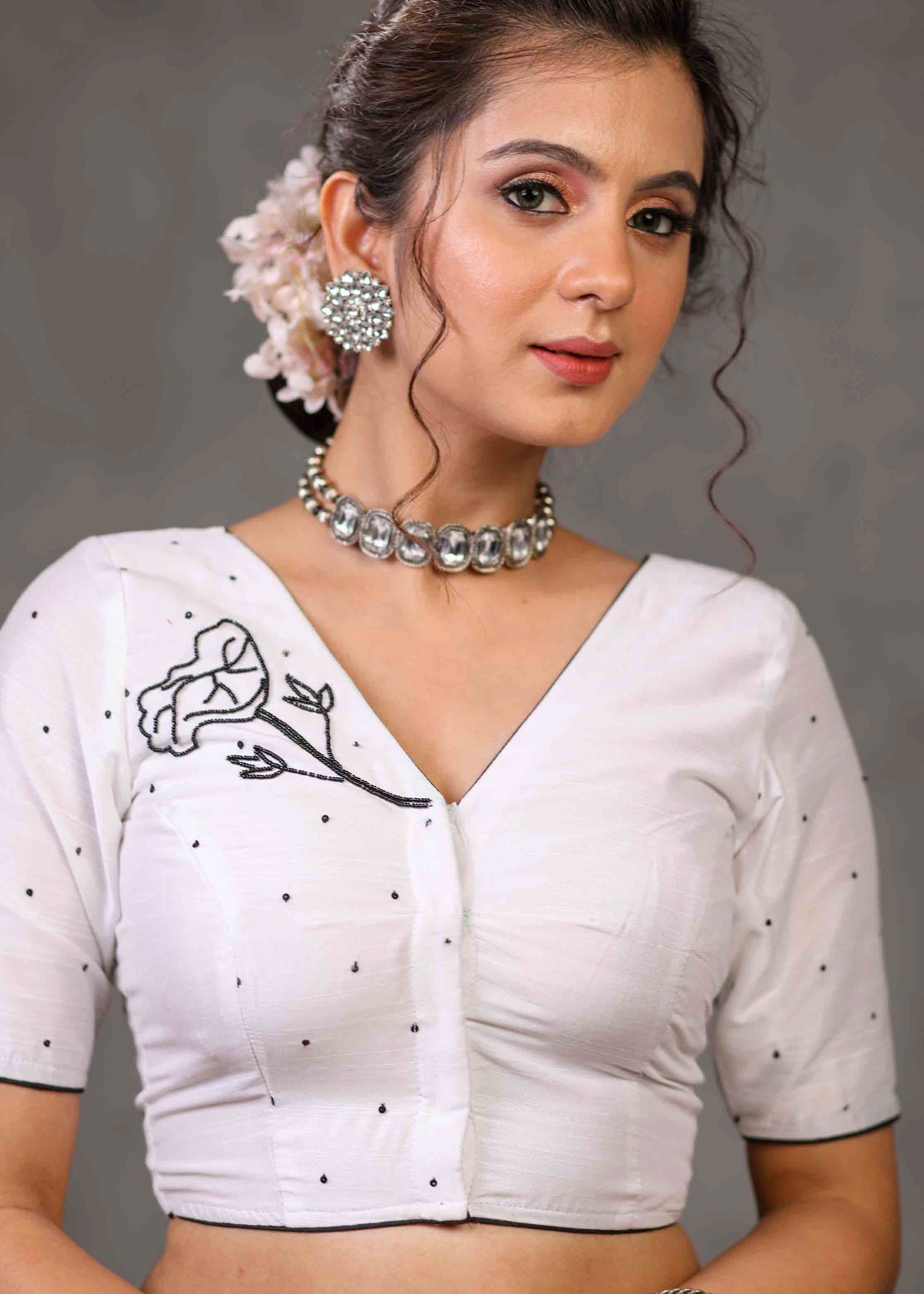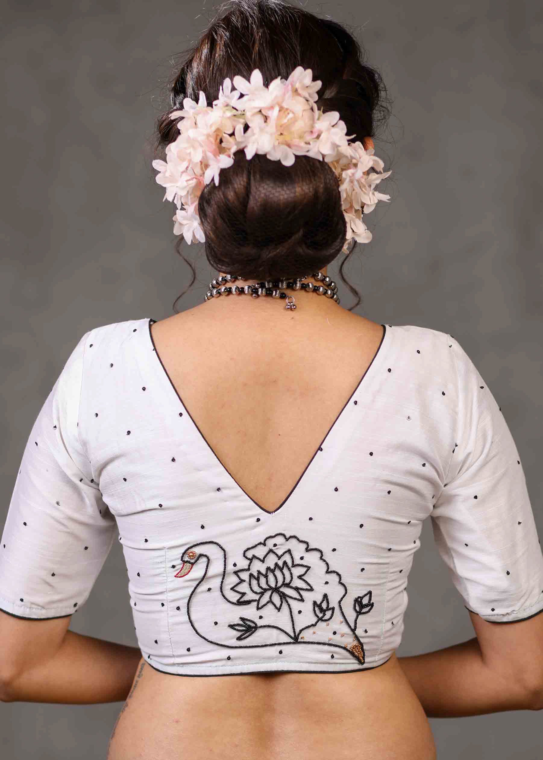 Elevate your style with this daring ivory cotton silk blouse, featuring exquisite swan embroidery on both front and back. Its luxurious fabric and intricate design make a bold statement, perfect for those who embrace elegance with an edge. Stand out effortlessly in this unique blend of classic charm and fearless fashion.