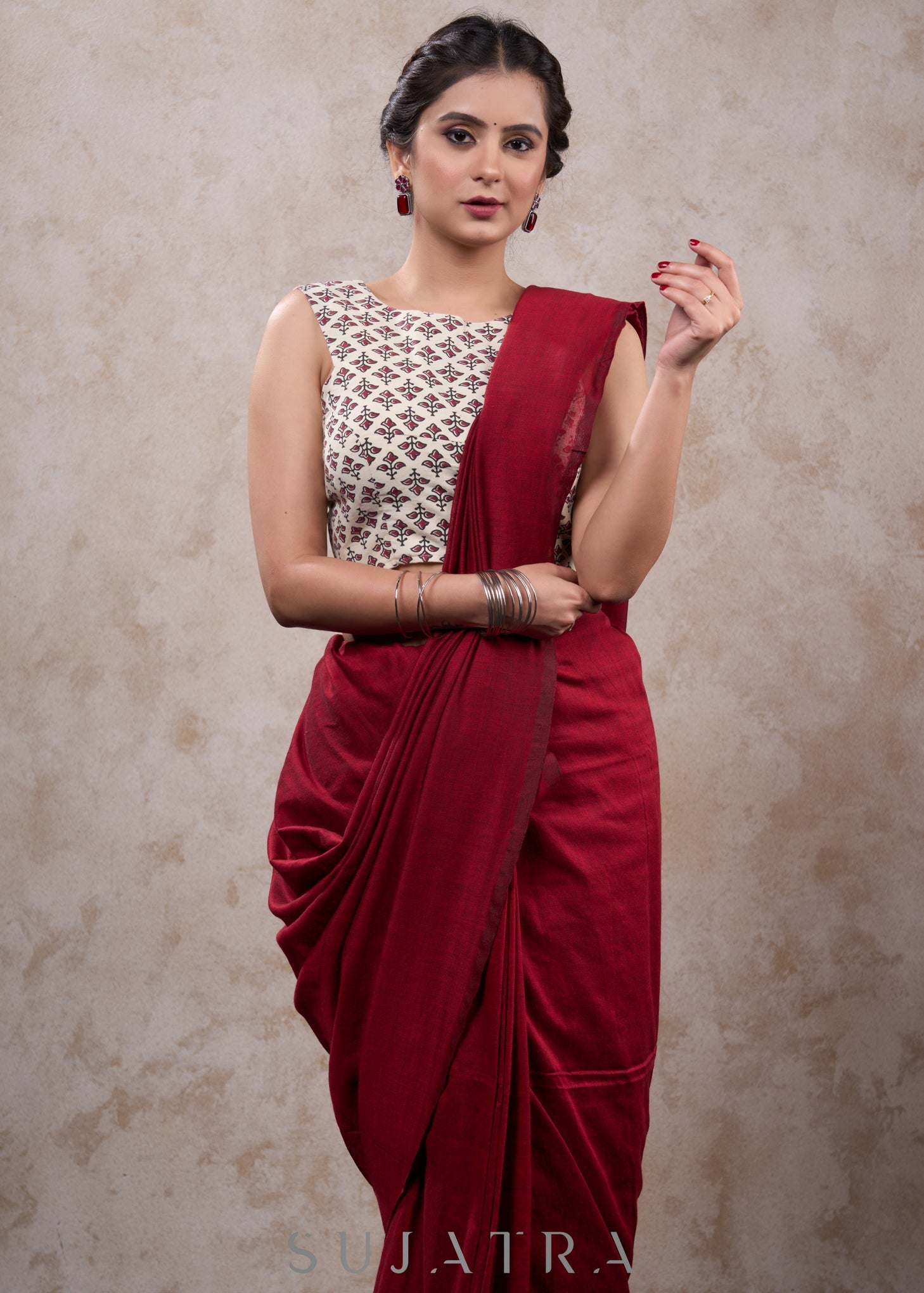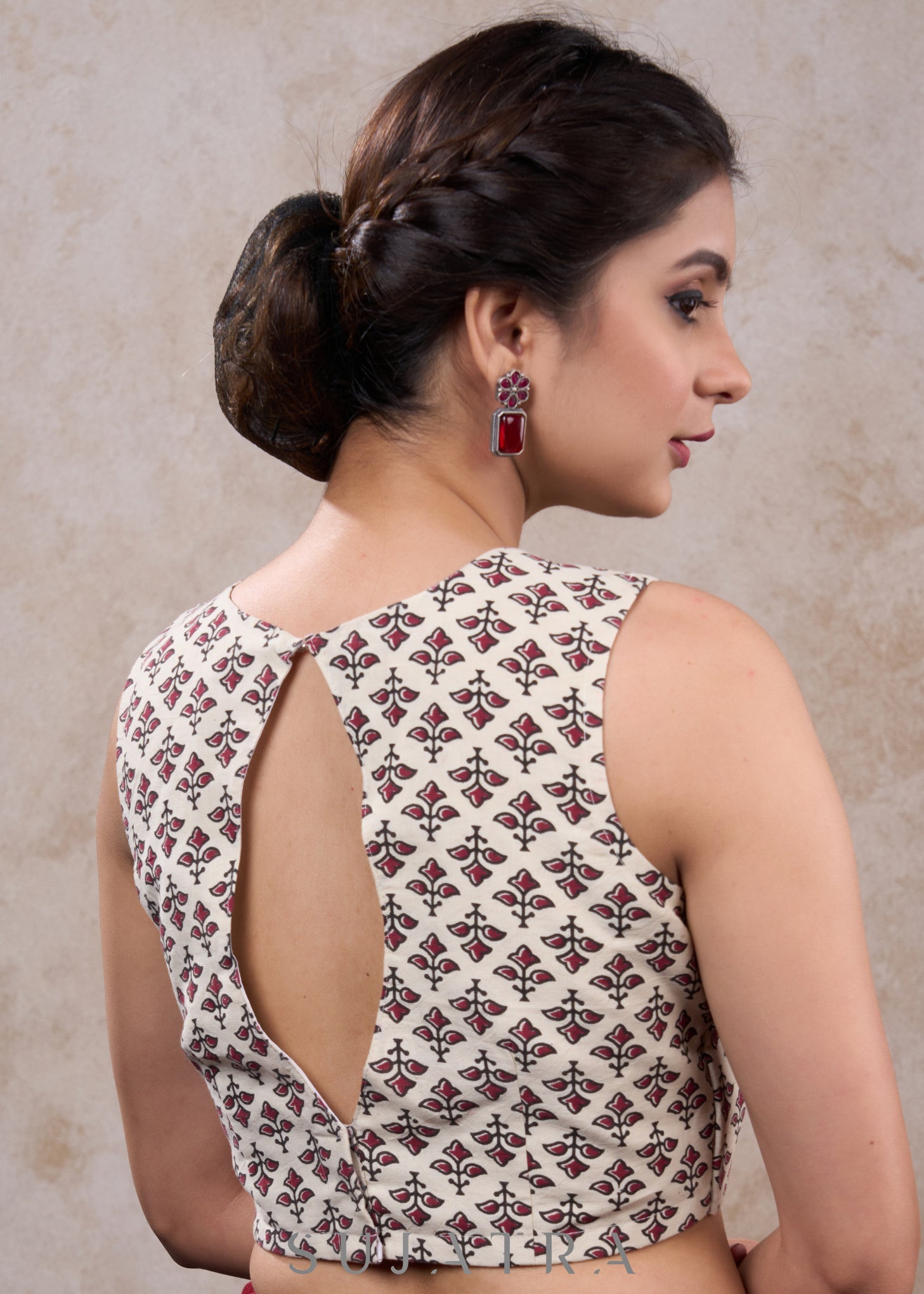 This sleeveless blouse combines classic elegance with breathable comfort, crafted from soft cotton fabric. Its white base features a subtle printed design, adding refined detail without overwhelming the look. Ideal for warm weather, the sleeveless cut ensures ease of movement and a cool feel, making it a versatile choice for both casual and semi-formal occasions.