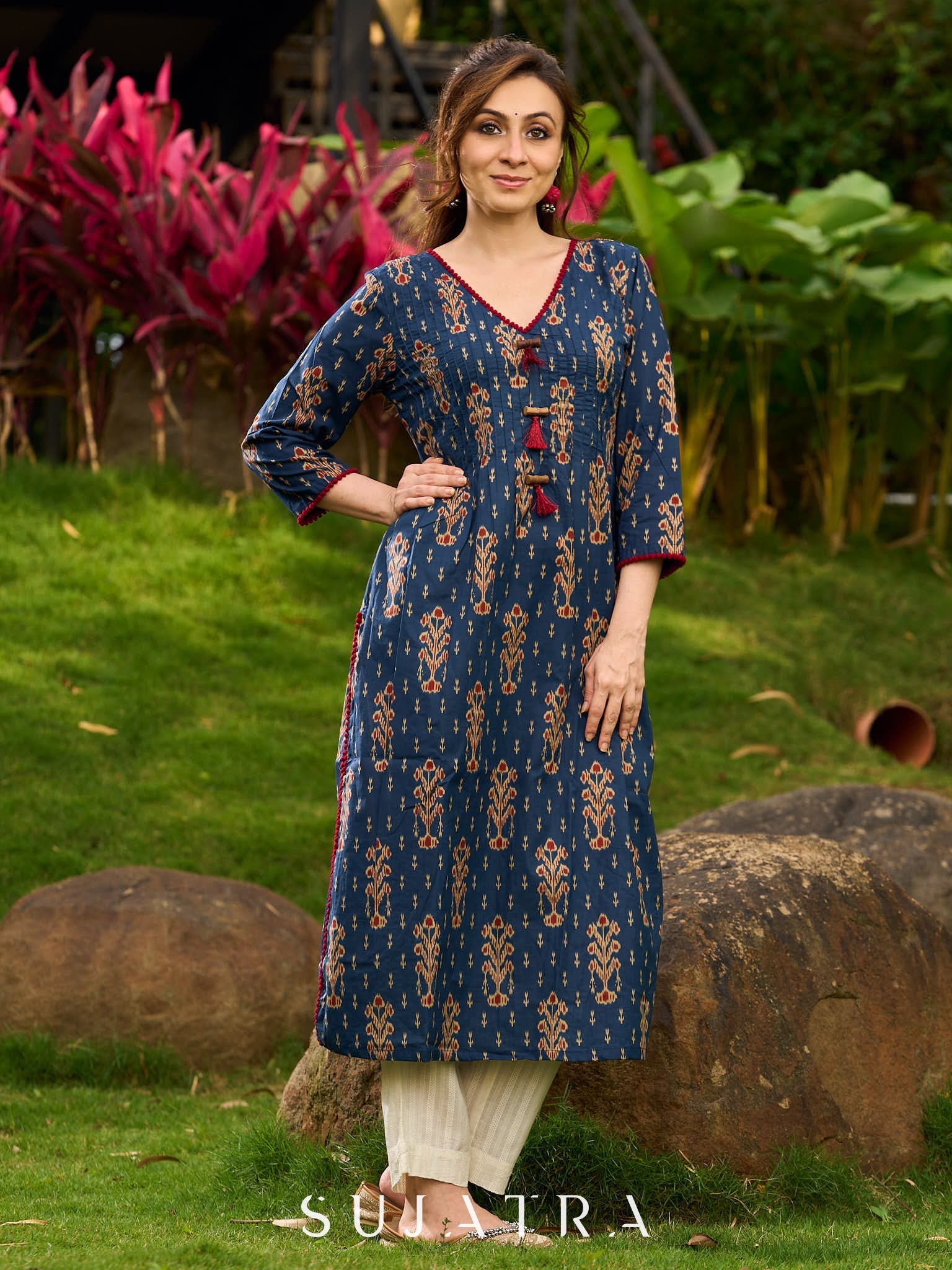 Contemporary Blue Ajrakh Print Kurta with Pleated Pintuck Detailing and Maroon Accents