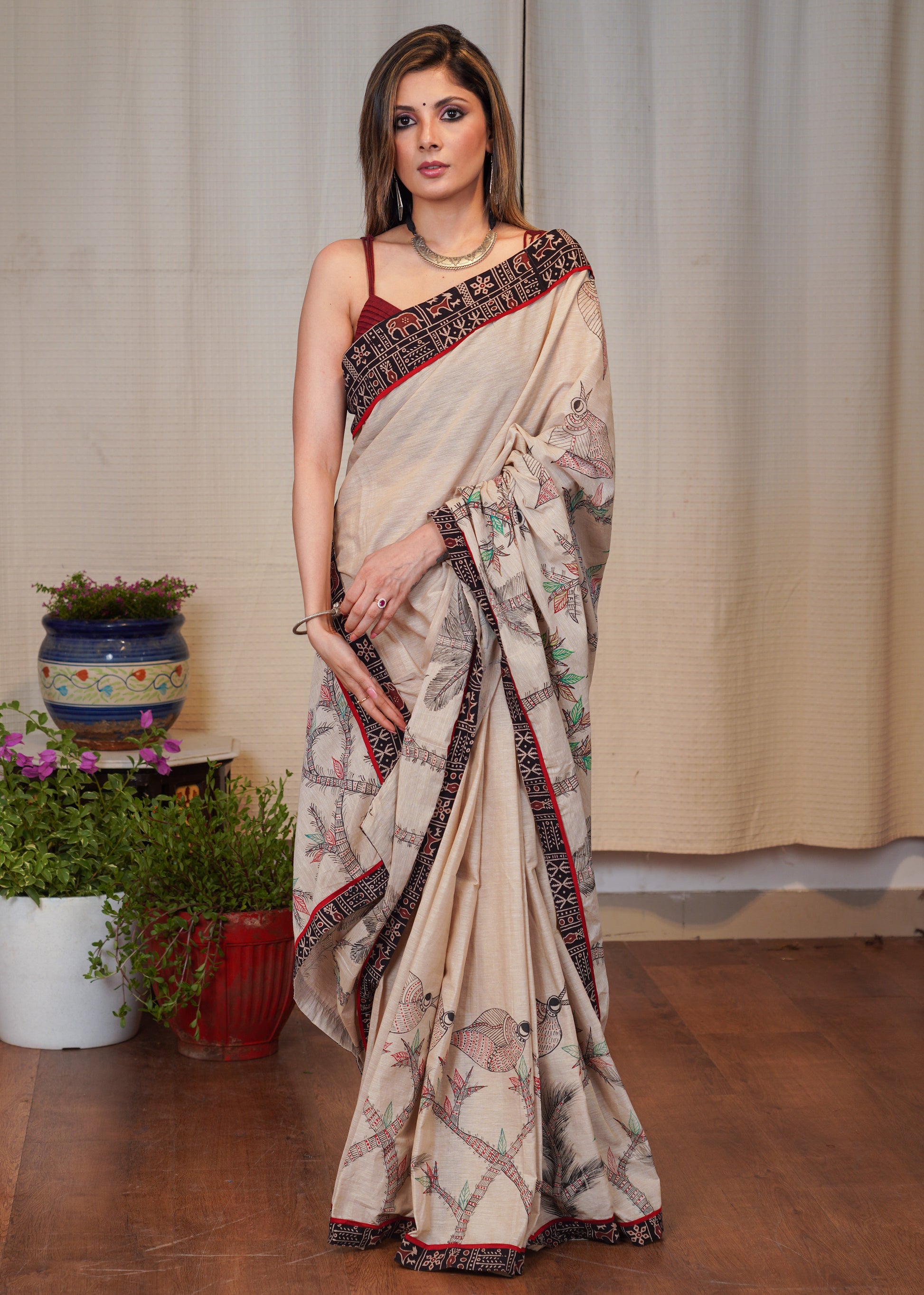 Wrap yourself in luxury with this exclusive Gond-painted beige cotton saree. Its intricate and elegant designs add a touch of sophistication and beauty to any wardrobe. Soft and lightweight, it's perfect for any special occasion.