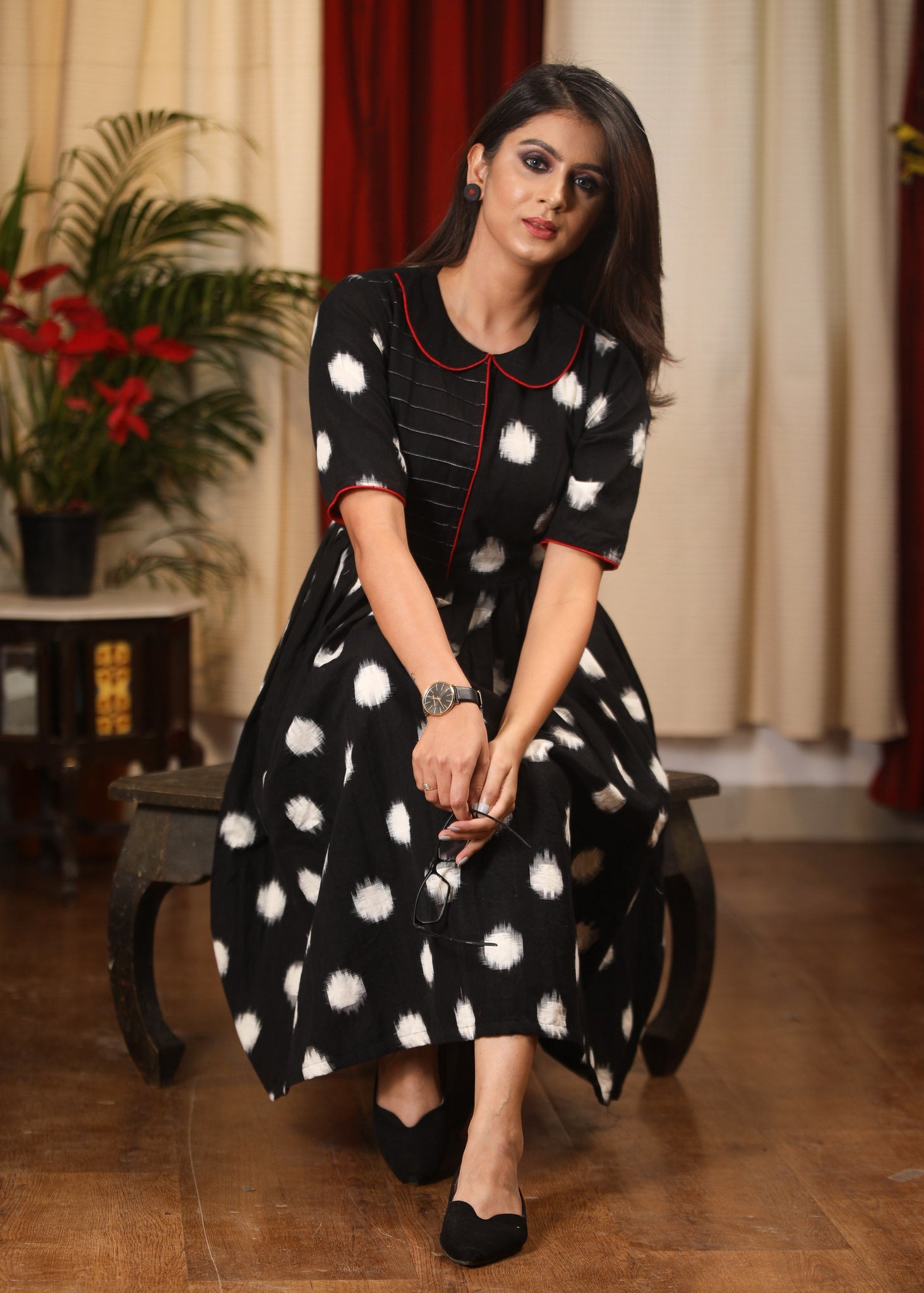 Authentic double ikat polka dotted dress with embroidered motif on pocket