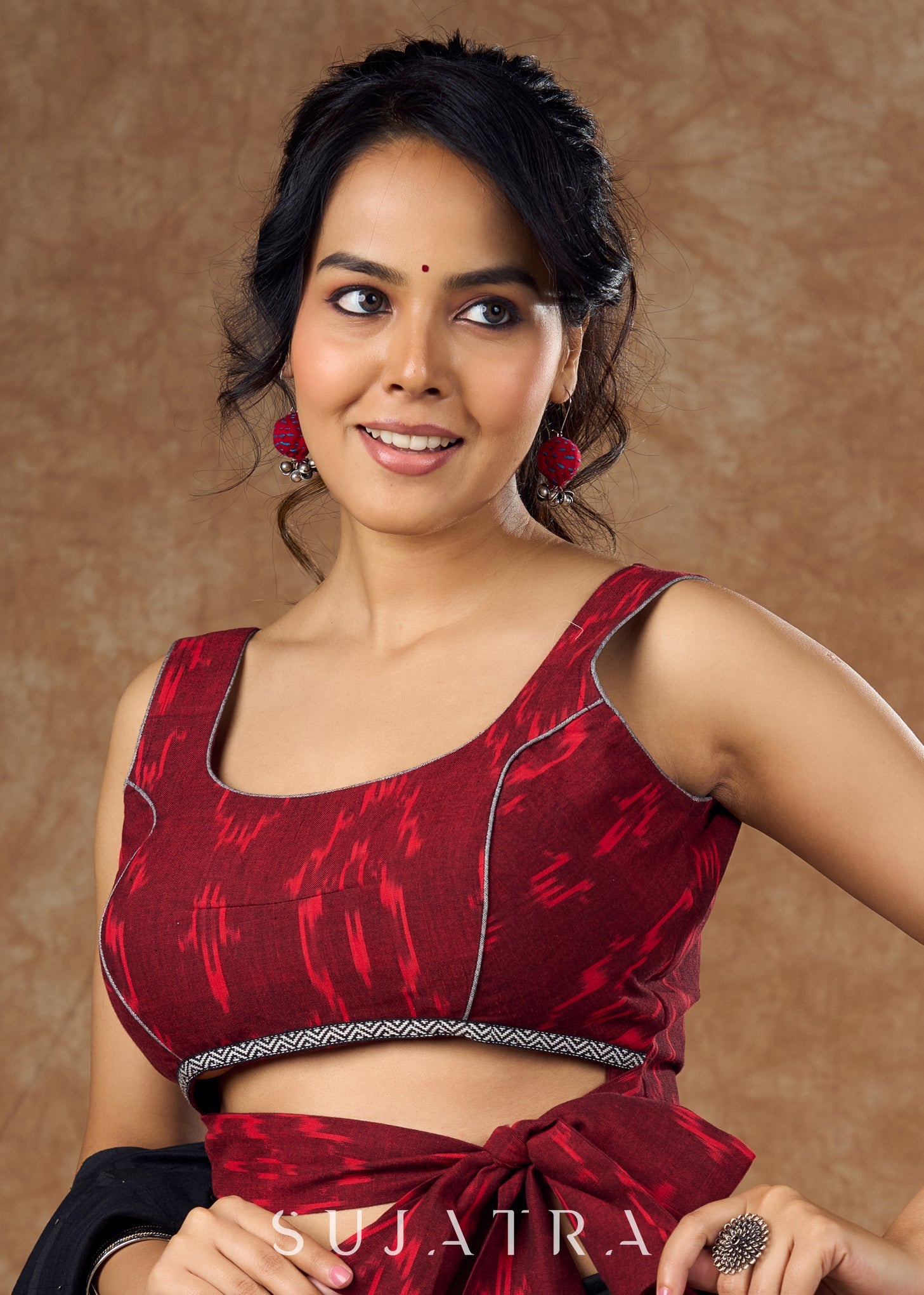 This cotton Ikat blouse features striking bold red patterns that add a vibrant touch to your wardrobe. Designed with a tie-up waist detail, it offers a customizable fit that enhances your silhouette while ensuring comfort. Crafted from breathable cotton, this blouse combines traditional craftsmanship with contemporary style, making it a versatile choice for both casual and semi-formal occasions.
