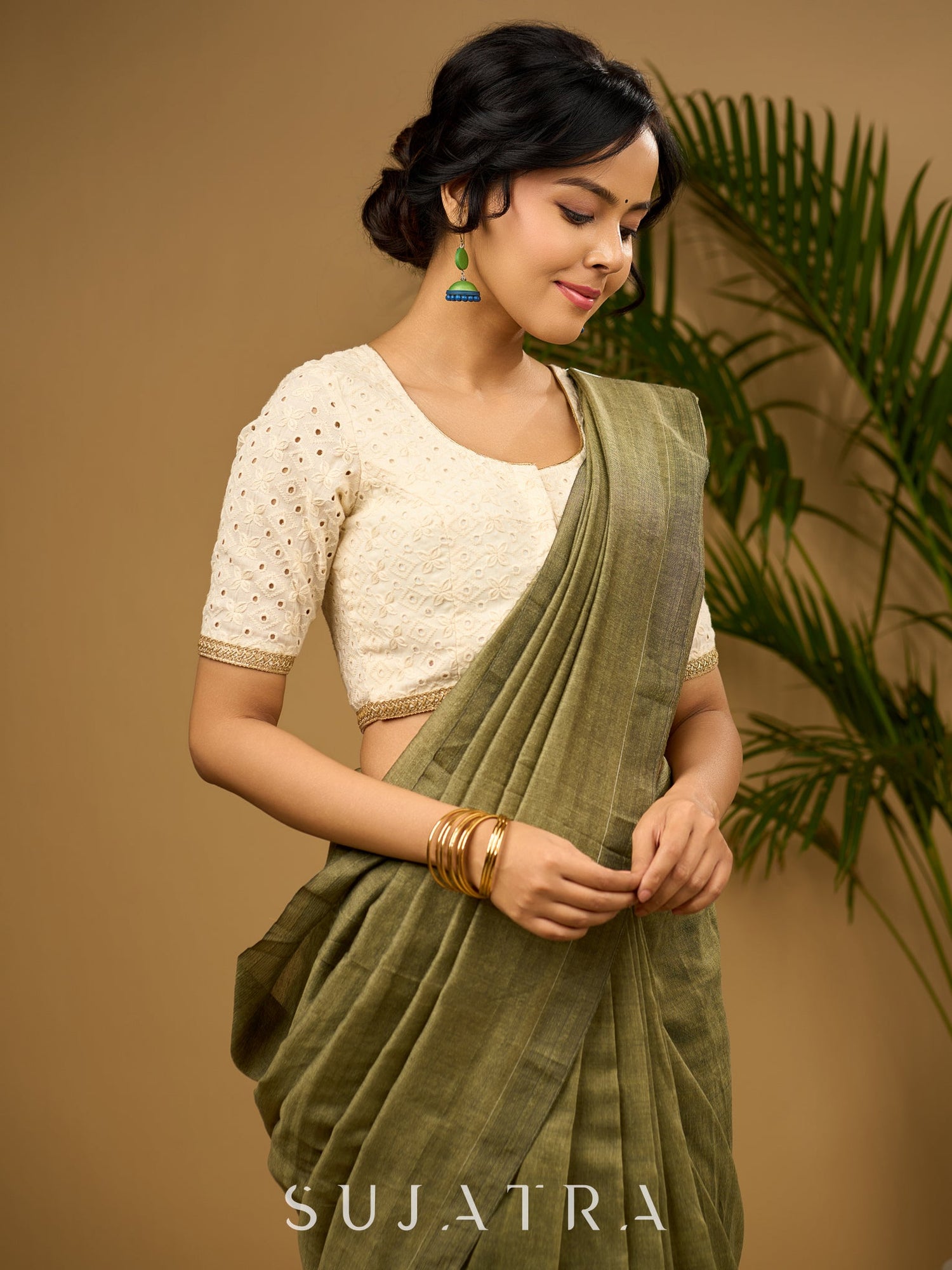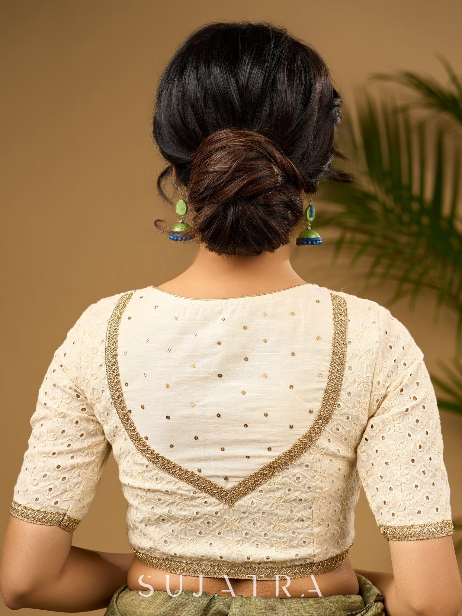 This delicate cotton Hakoba blouse features intricate floral patterns that enhance its traditional charm. Crafted from breathable cotton, it offers comfort and elegance, making it an ideal complement to a plain saree. Its detailed design adds a refined touch, perfect for those seeking a blend of classic style and subtle sophistication.