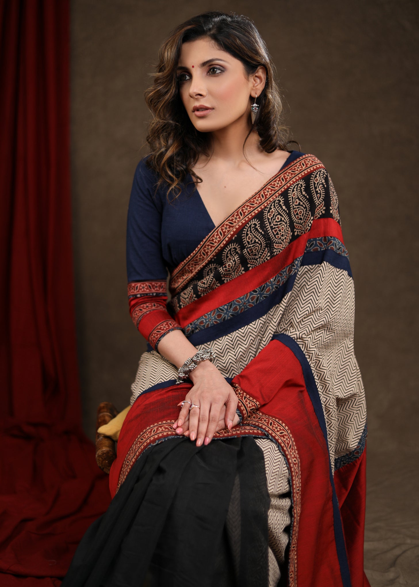 This Designer Red & Black Cotton Silk Saree with Ajrakh Combination is a luxurious item made with high-quality fabric and intricate Ajrakh print. A fusion of sophistication and comfort, this piece is ideal for special occasions.