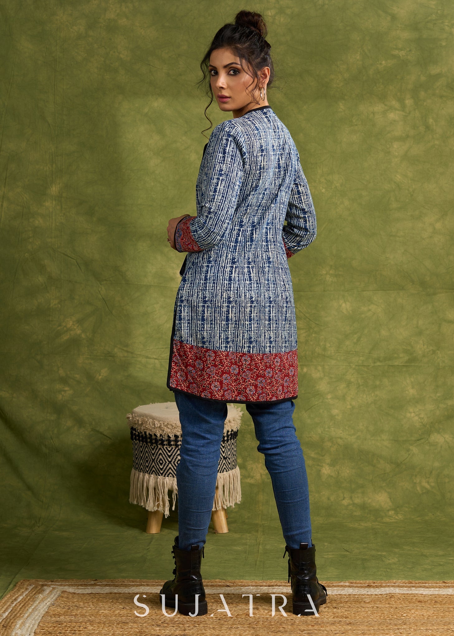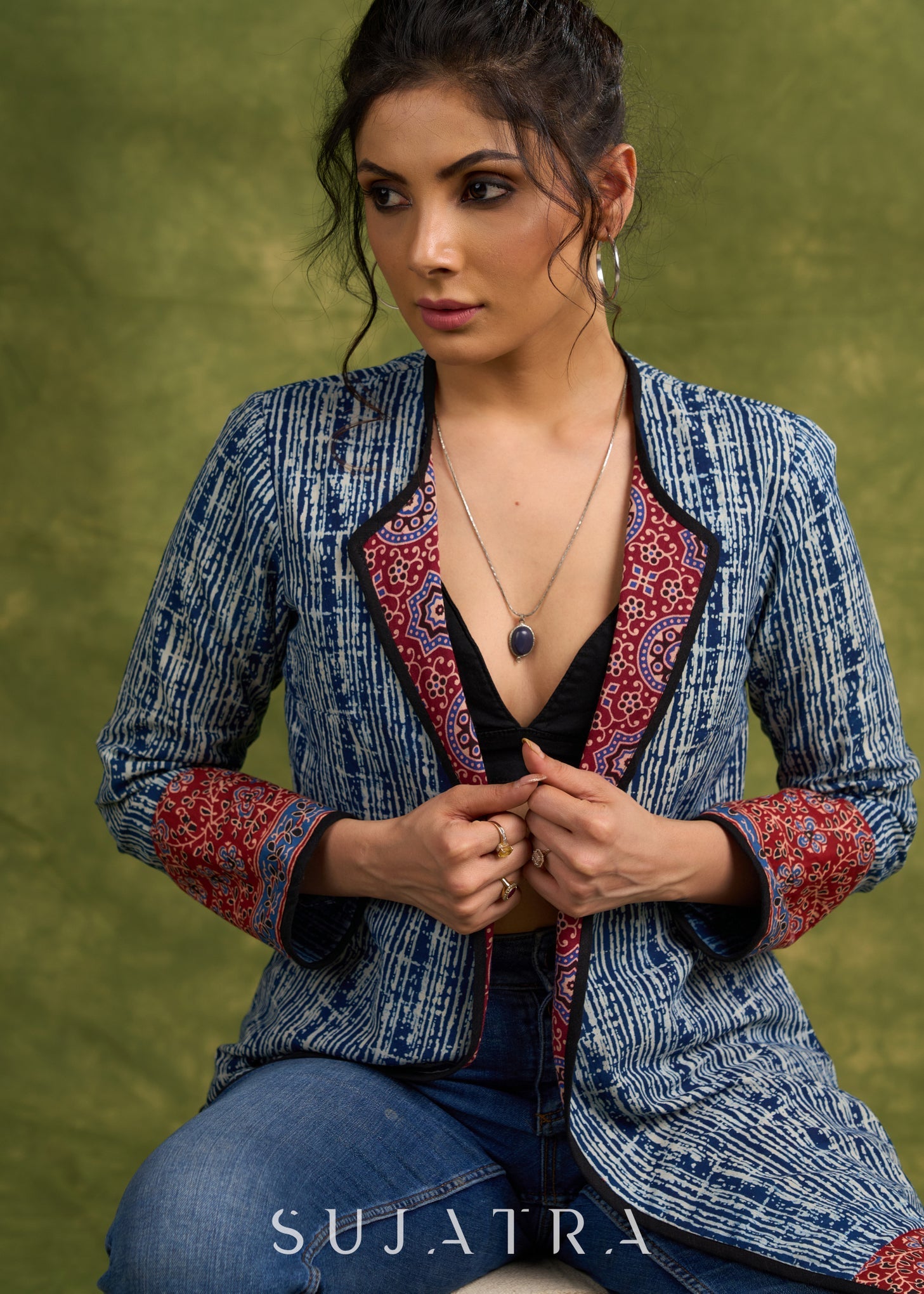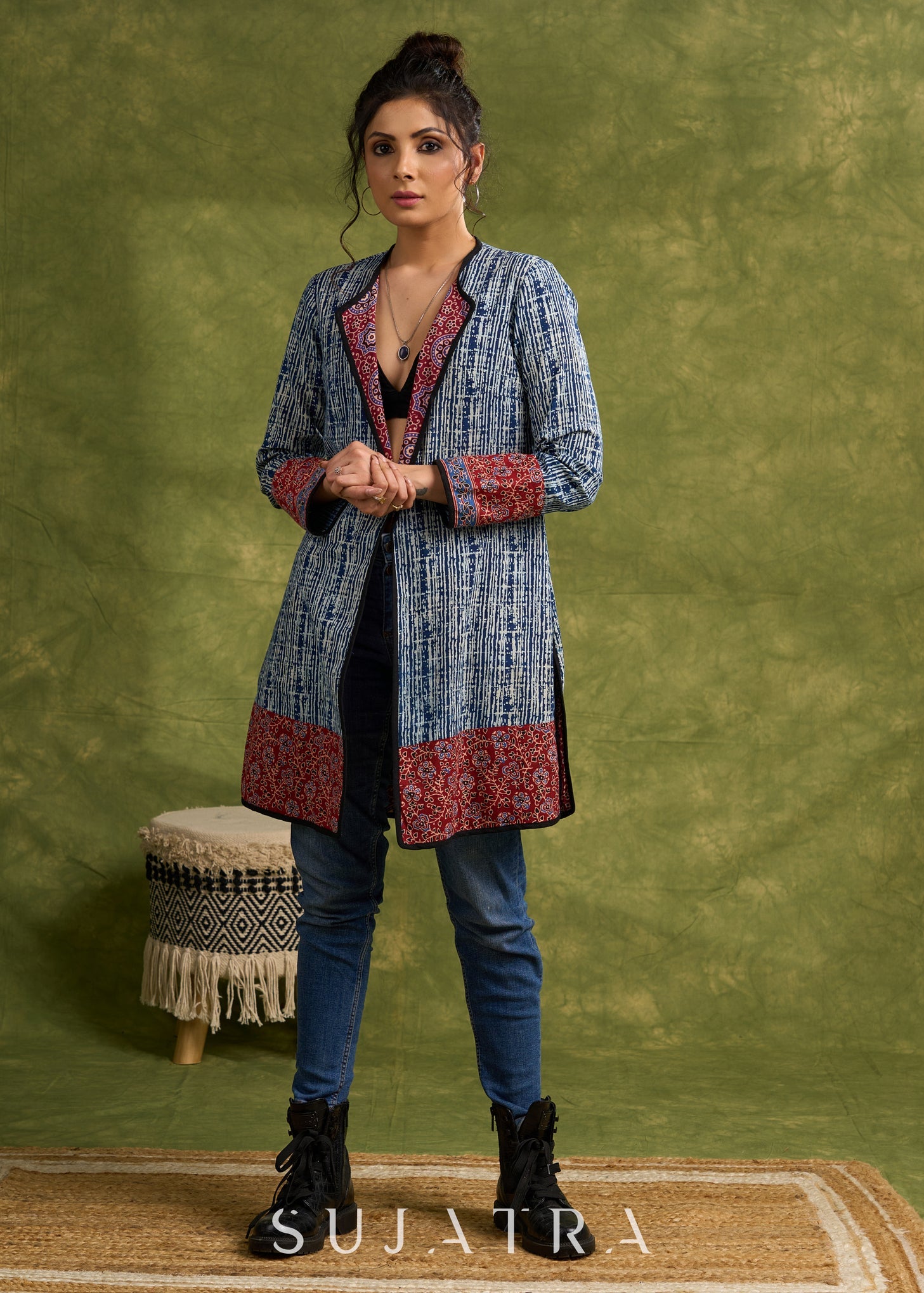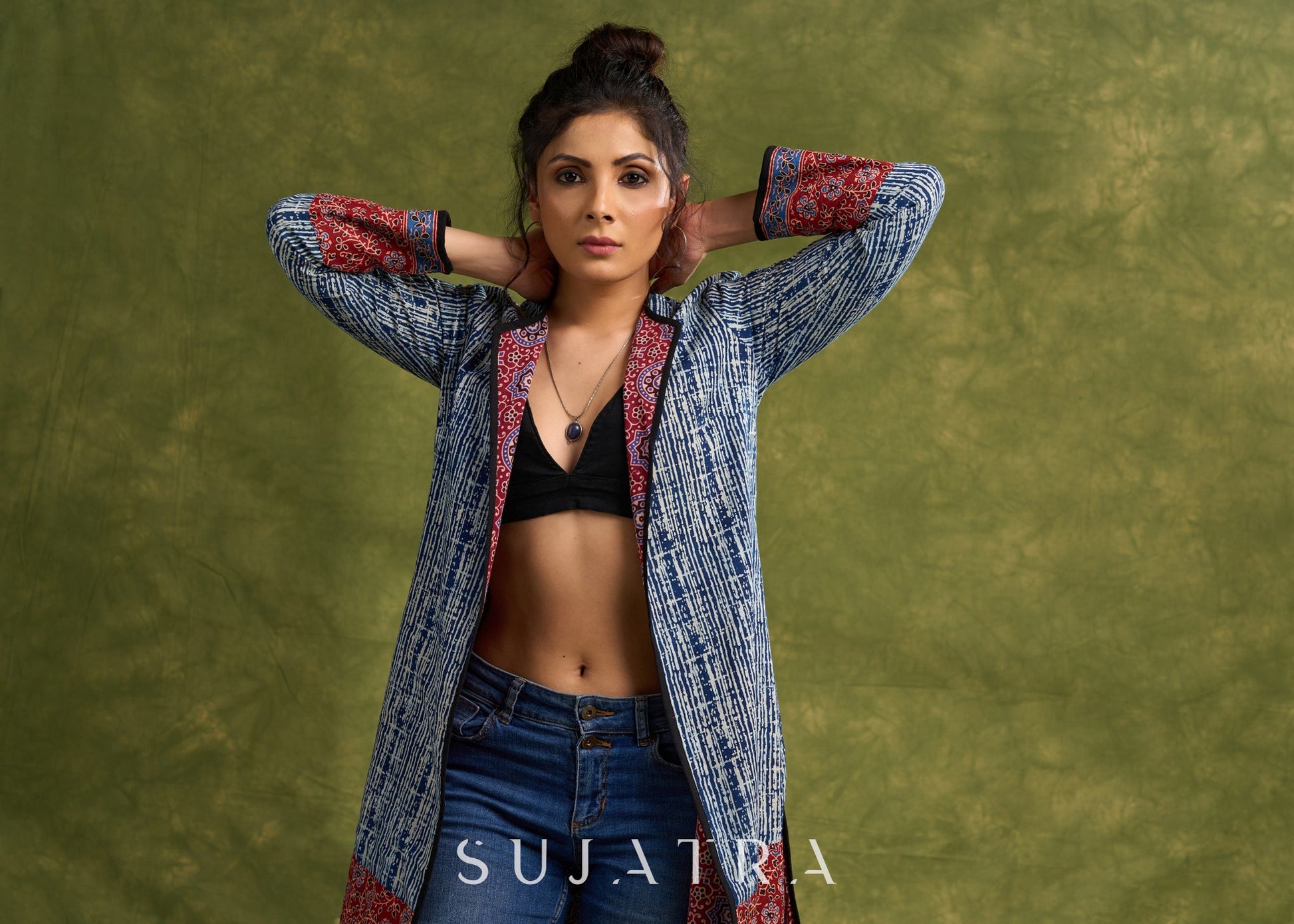 Dramatic Elegance: Indigo Blue Long Shrug With Exquisite Ajrakh Lining