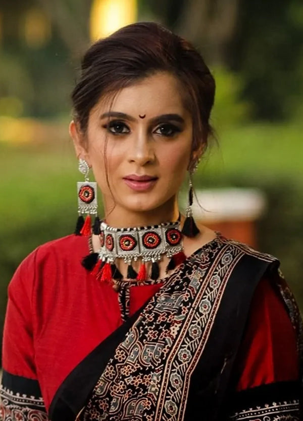 Artisanal plain navy blue Cotton saree with Ikat blouse piece