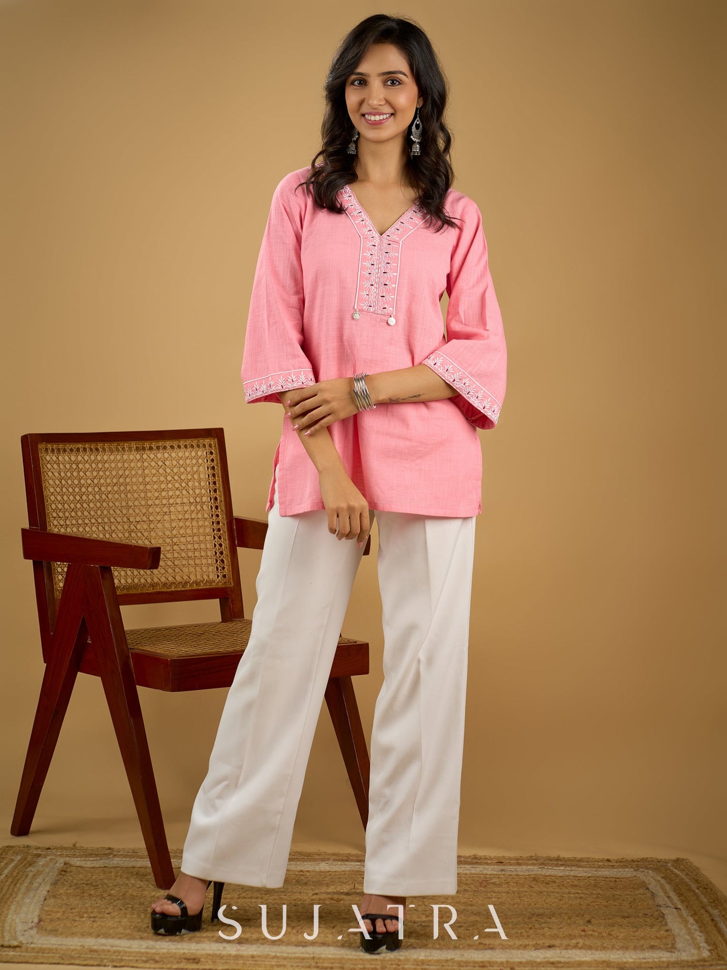 Soft cotton elegance meets delicate craftsmanship in this baby pink top. Intricate thread embroidery adorns the fabric with subtle sophistication. Perfect for layering or standalone wear, this piece offers timeless charm. Premium cotton construction ensures comfort and breathability. Generously cut for a relaxed fit.