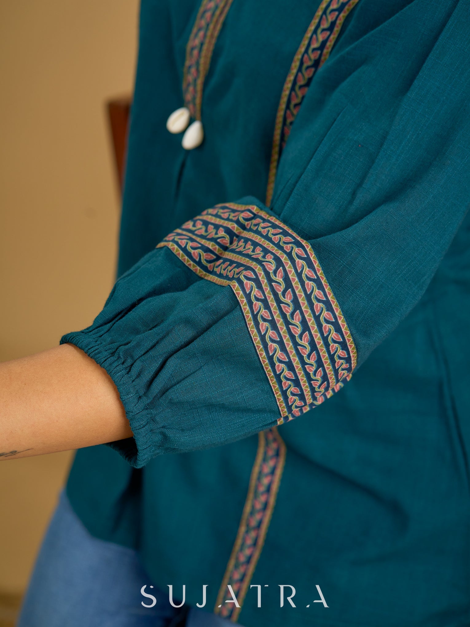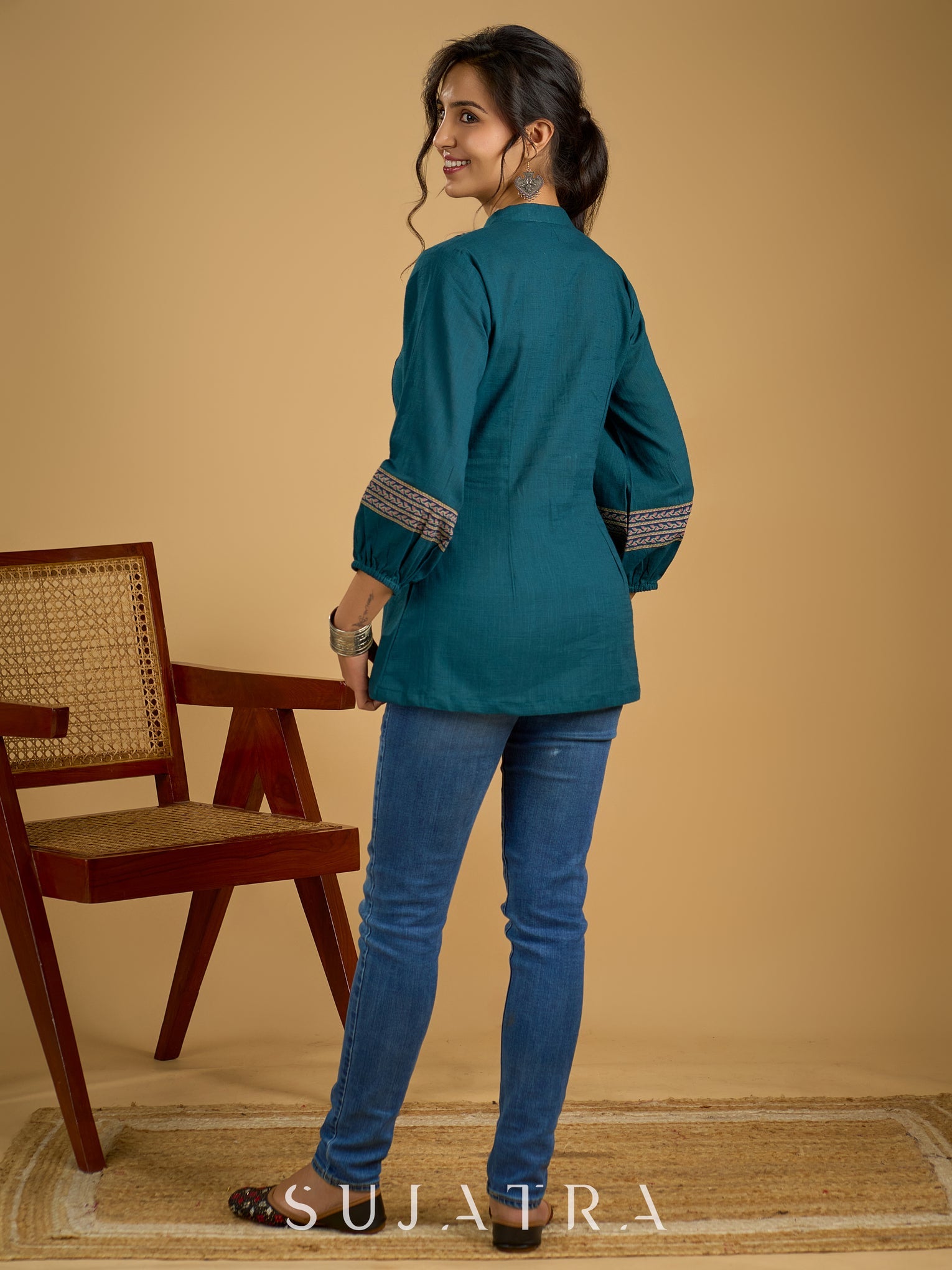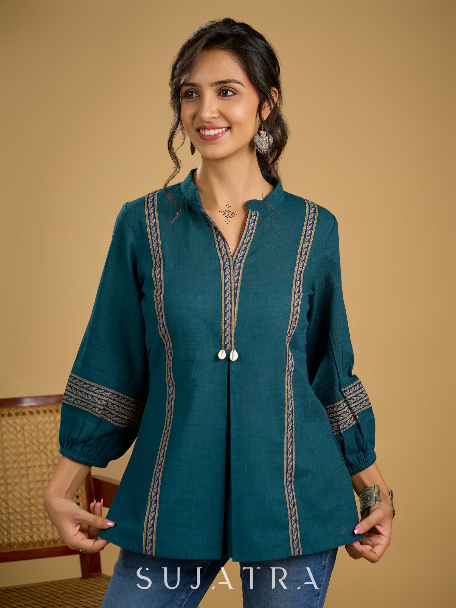 Elegant cotton teal top featuring graceful and unique detailing.