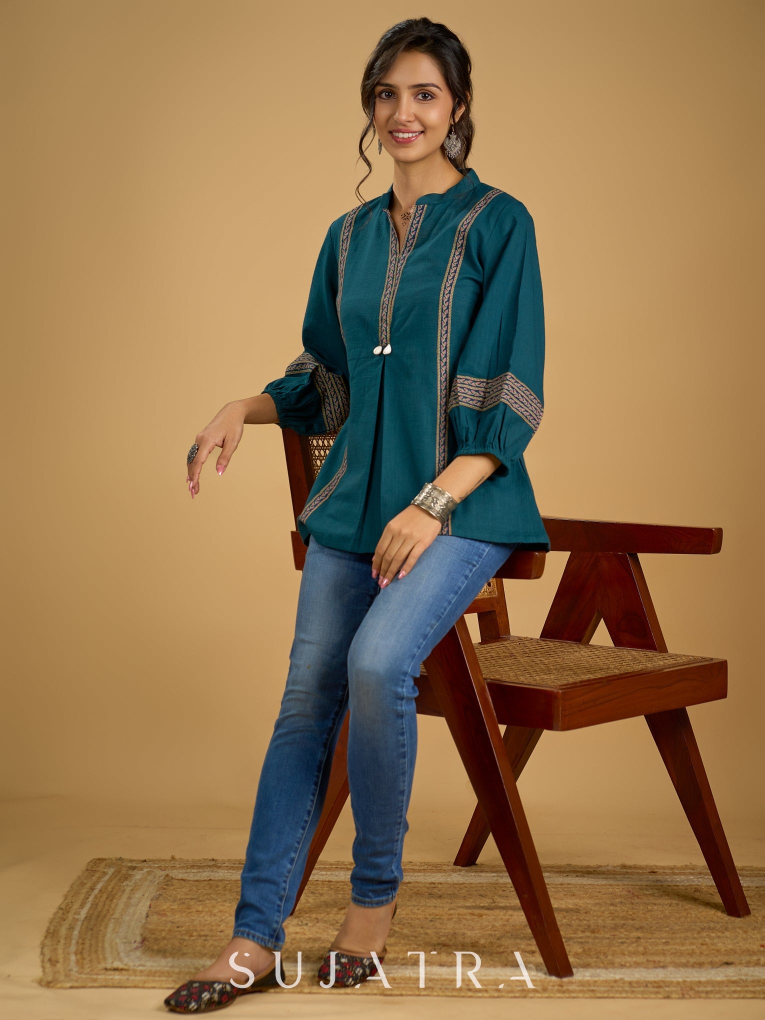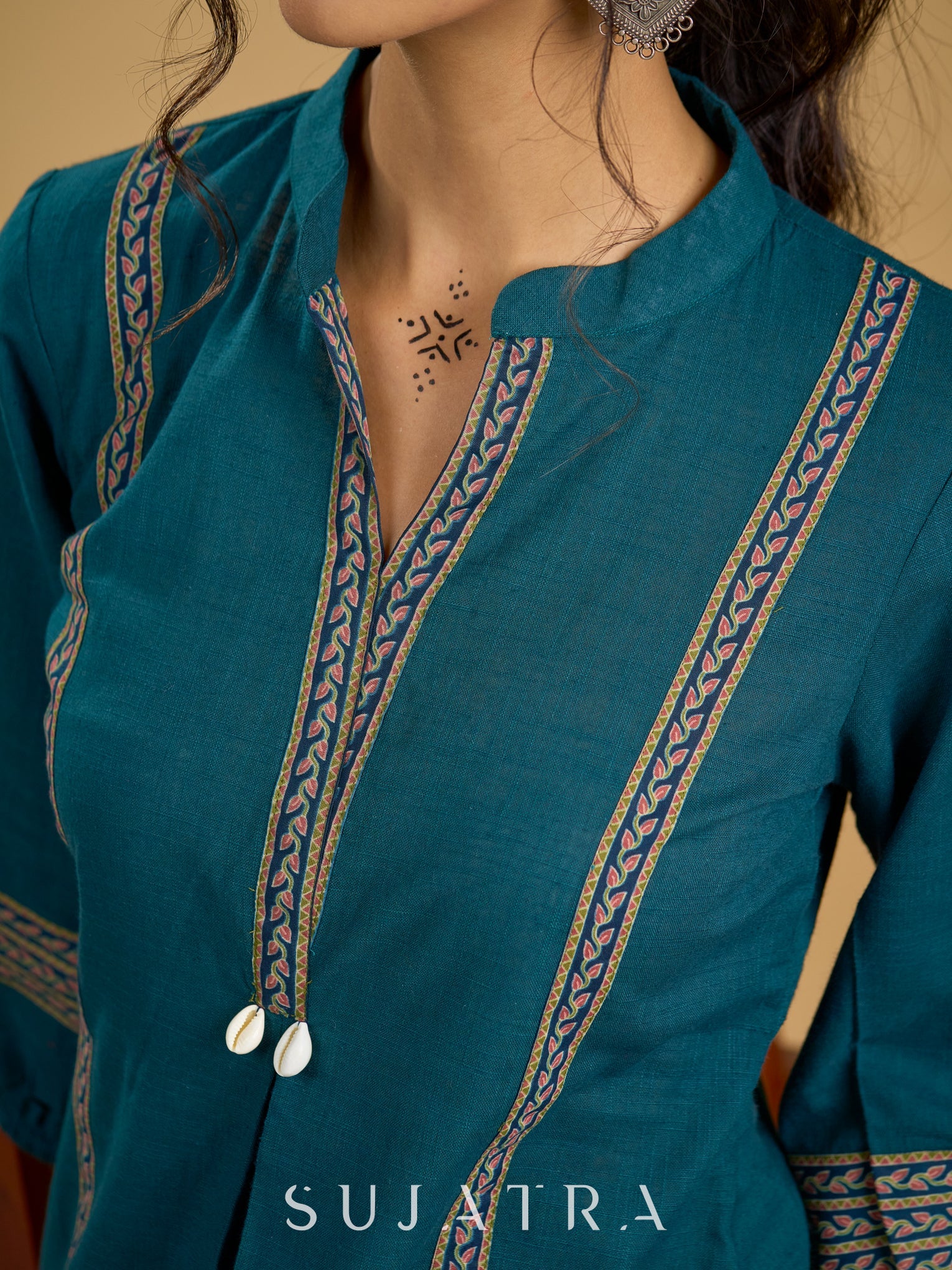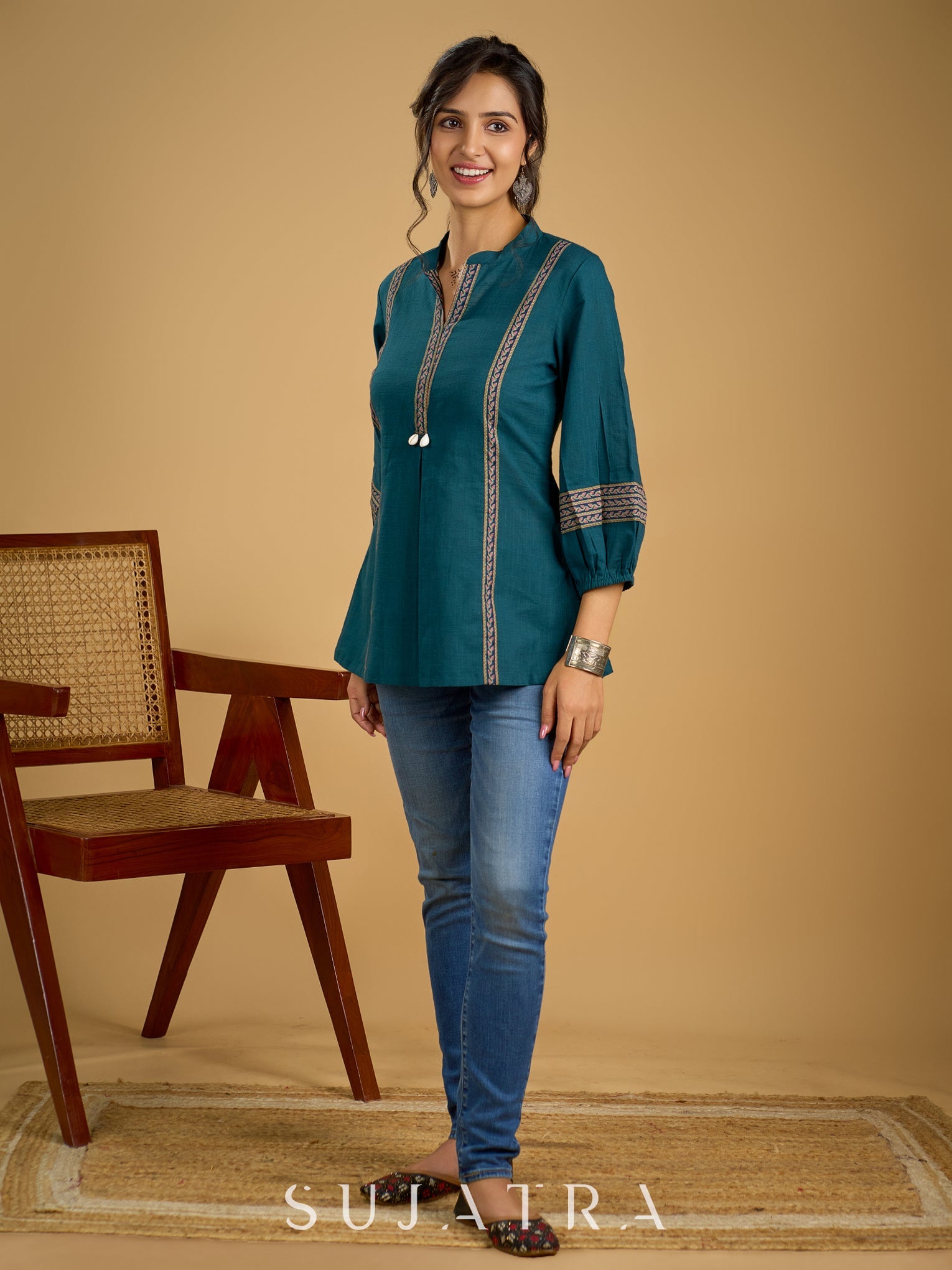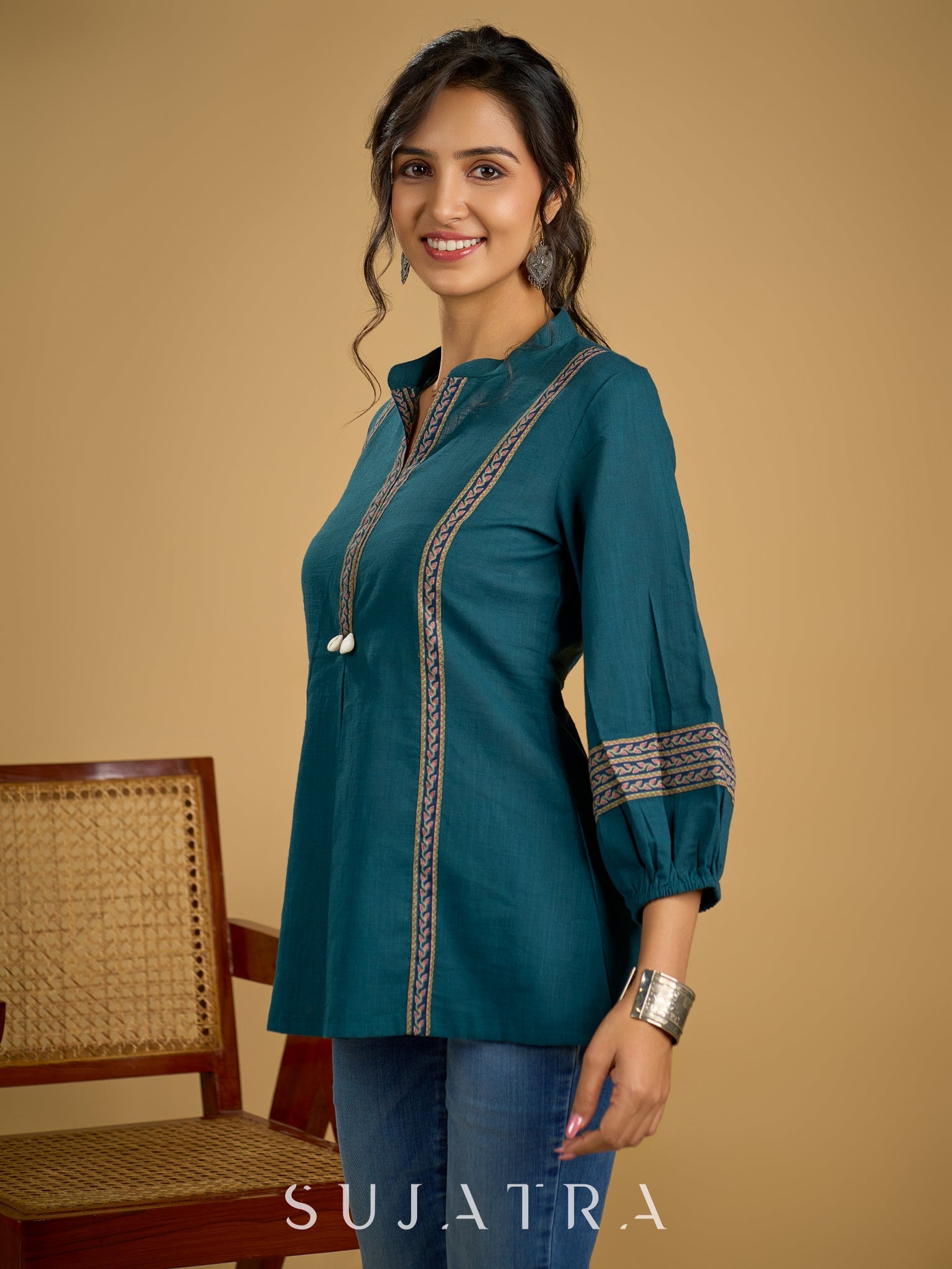 Elegant cotton teal top featuring graceful and unique detailing.