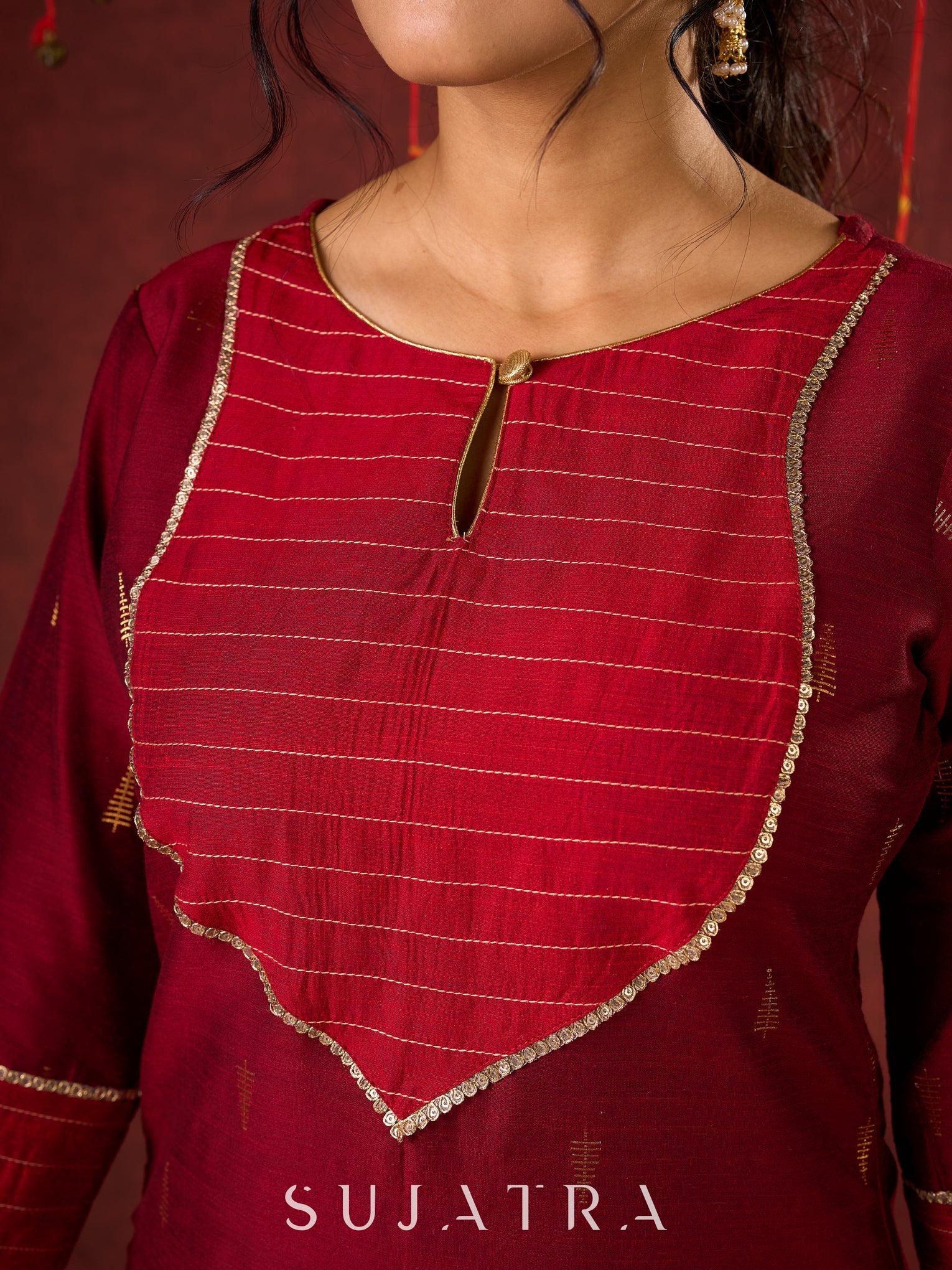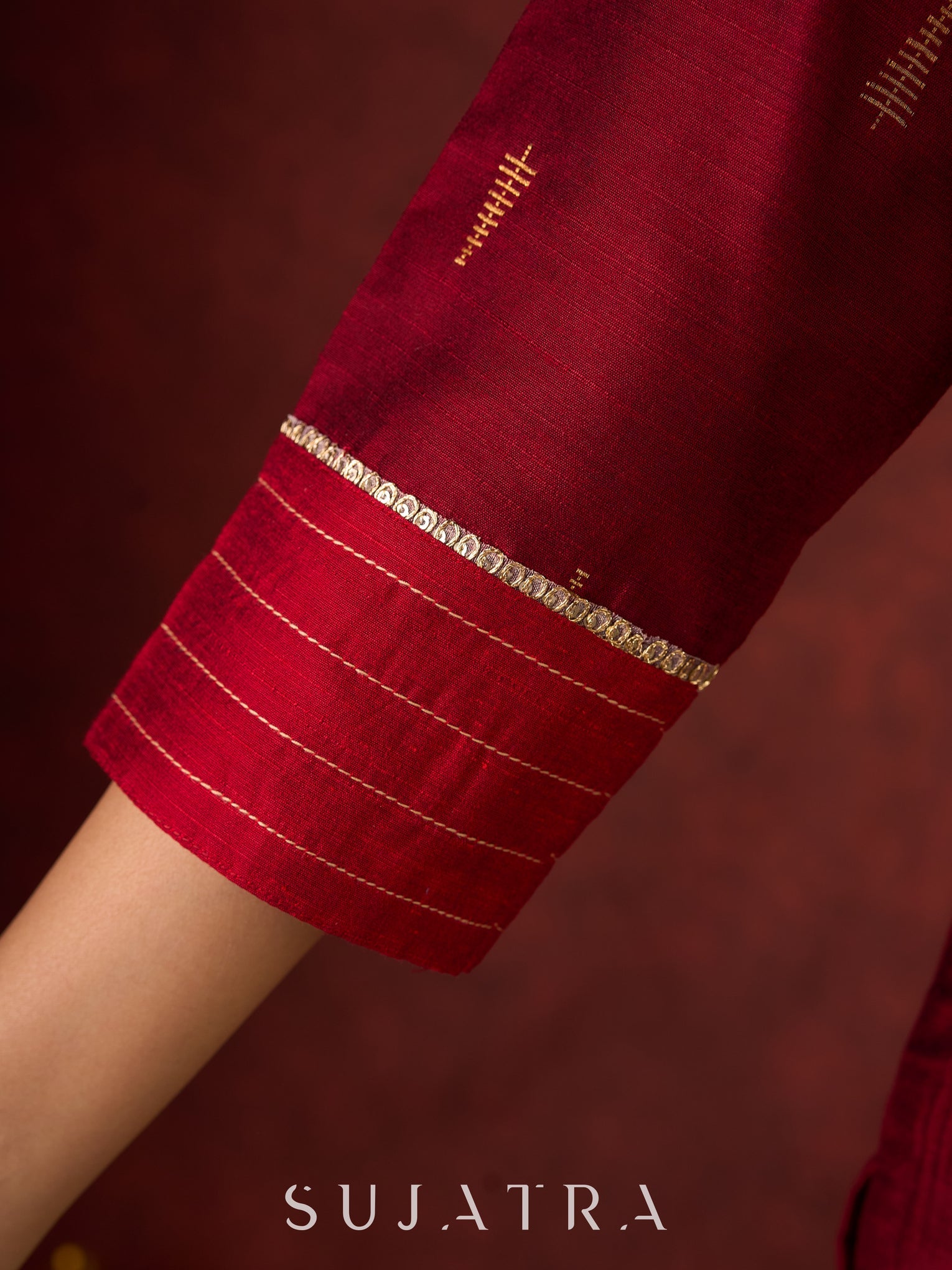Elegant straight-cut kurta in maroon with shimmering golden buttis - Pant and Dupatta optional