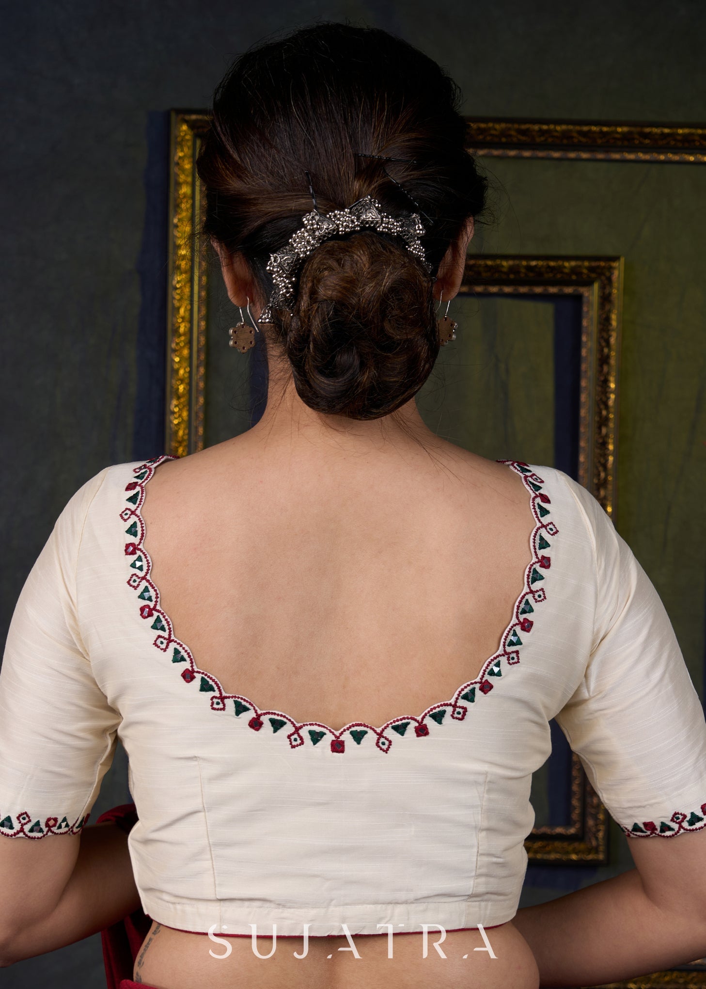 This embroidered scalloped blouse, crafted from a luxurious blend of cotton and silk in an elegant off-white shade, offers both comfort and sophistication. Its delicate scalloped edges and intricate embroidery enhance its refined appeal, making it an ideal choice for pairing with a plain saree. Perfect for those seeking a timeless, expert-crafted garment that balances traditional artistry with modern elegance.