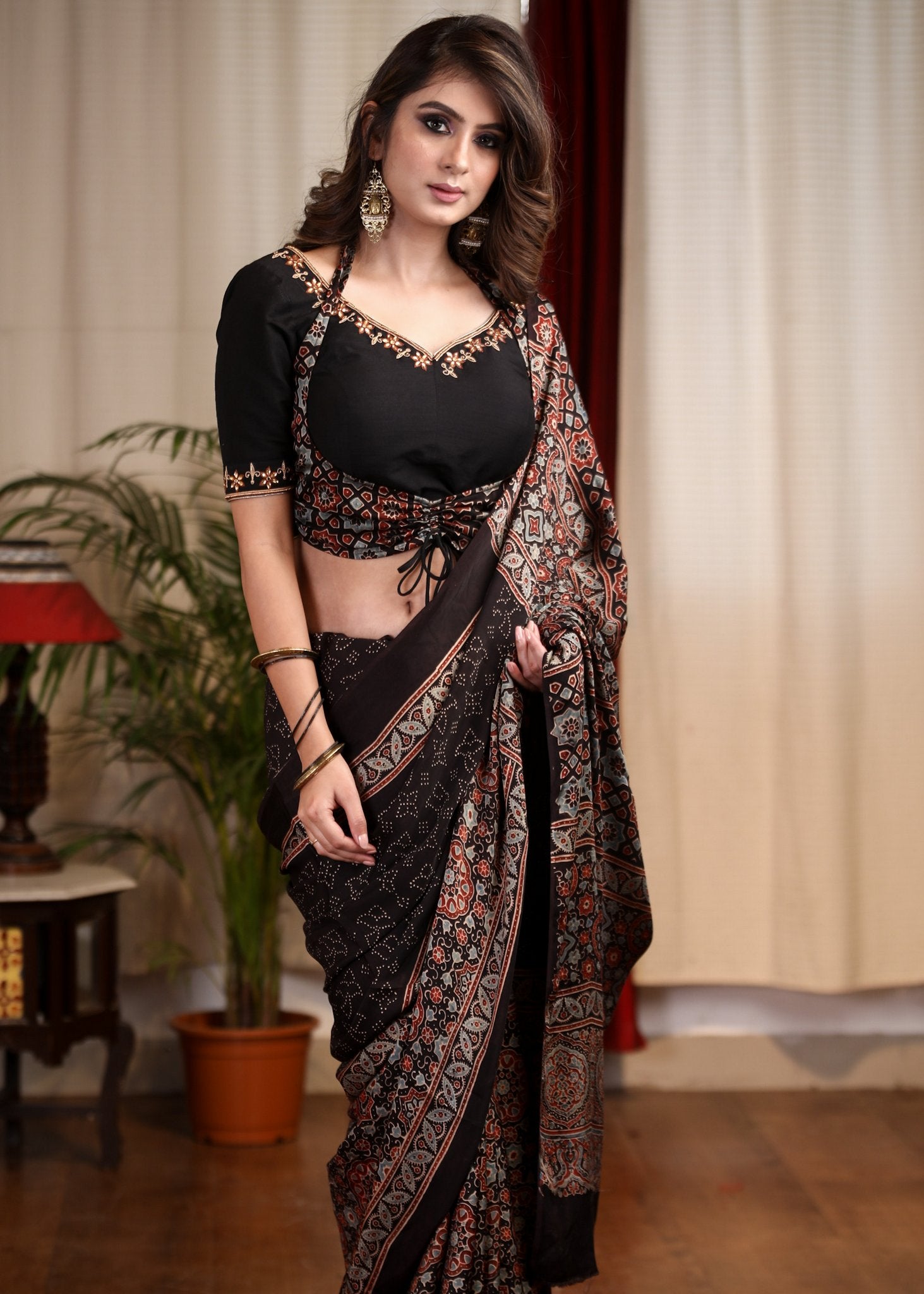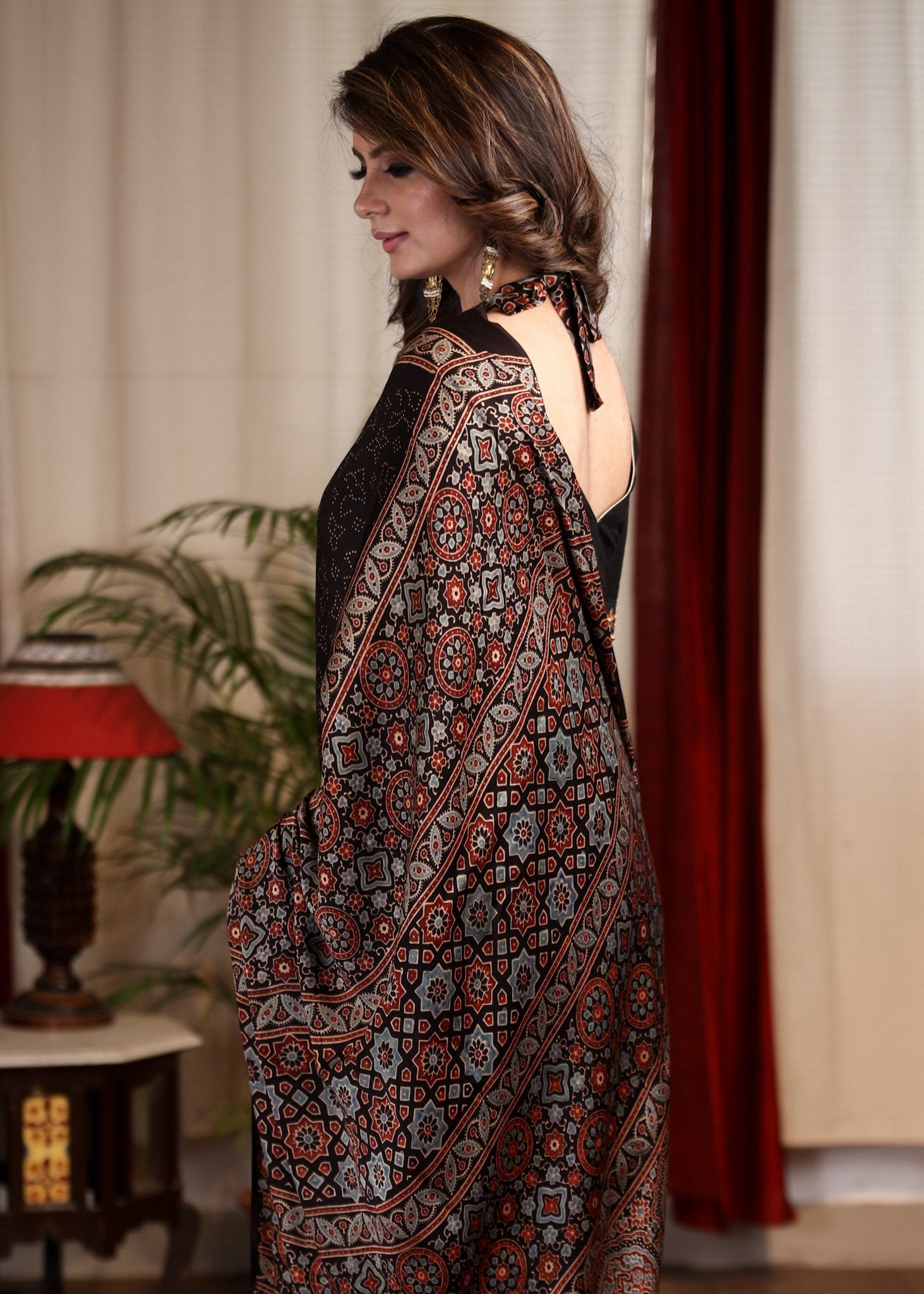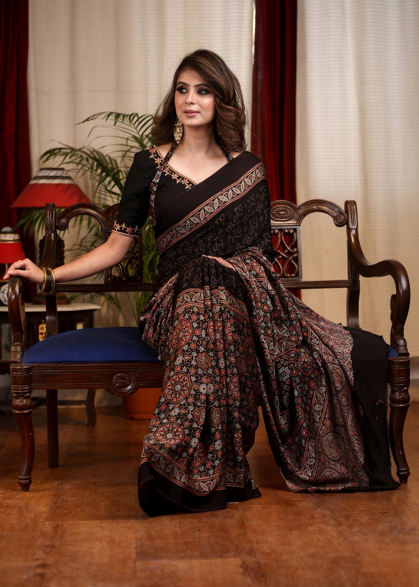 This exclusive black modal silk saree features block printed design for a unique and beautiful look. Crafted with high-quality modal silk, it's lightweight and comfortable to wear for any occasion.