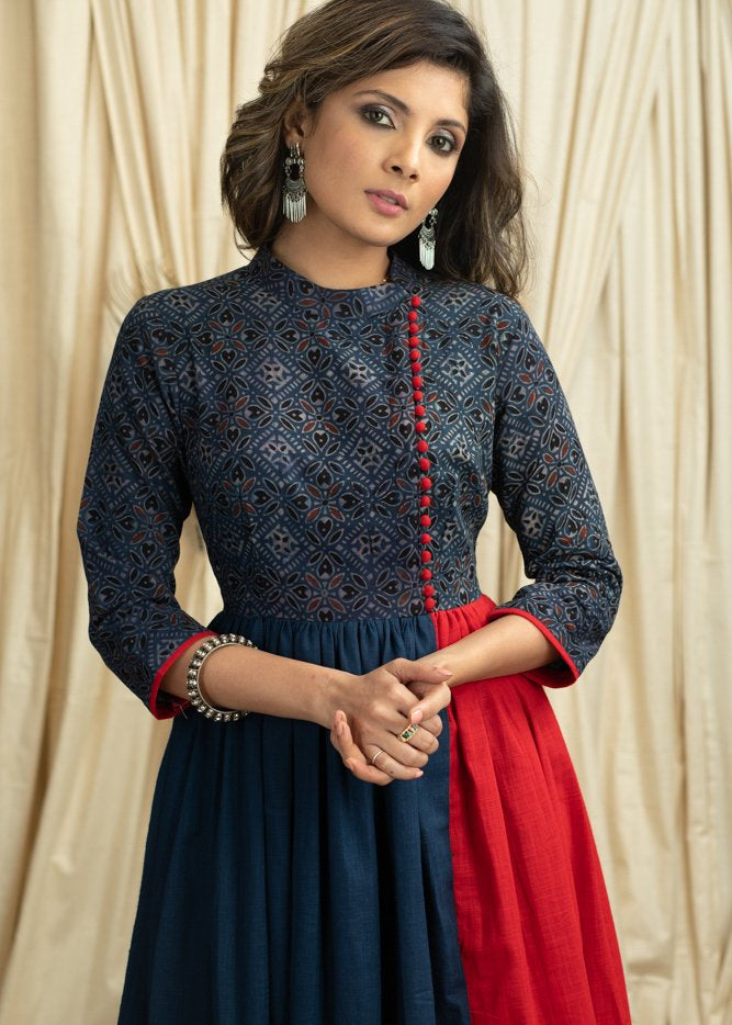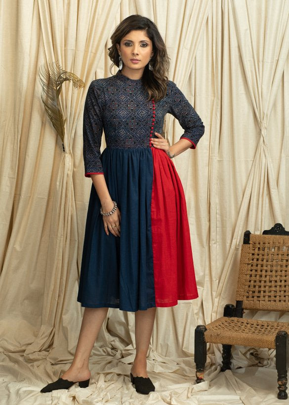 Exclusive blue & red combination dress with Ajrakh printed yoke